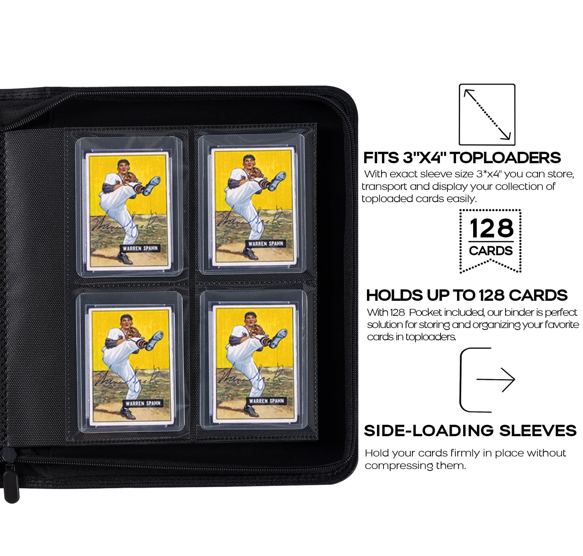 Specially Designed for Toploaders Storage & Display - Tailored Made transparent pockets with low-friction backing creating a separation between the front and back pockets as well as providing cards a classic framed look. enhanced Material Clear display on transparent inner pages Convenient and quick search toploaded card display. | Holds 128 Top Loaders - Our toploader binder holds 128 top loaders enhanced top loader binder with 8 card sleeves and Each page can holds 16 toploaders. Provides plenty of space to keep all your cards organized not disorganized. | Max Protection for Card Collection - Heavy duty material which makes It more resistant to water and dust Designed to keep card securely in place. Quality zipper keep cards protected and intact when not in use. Padded extra rigid front and rear covers made from non-slip water resistant material. | Long Term Use - Compared to other paper or soft boxes on the market Our toploader binder combines storage and display functions. Our toploader Binder for sports cards can better protect your precious cards collections have a longer lifespan and are convenient for long-term use. | Buy with Confidence - Your satisfaction is our top priority plz rest assured to purchase our 4 pocket toploader binder. If you are not satisfied with our top loader binder 4 pocket or have any questions please feel free to contact us at any time Let us remove any worry or hassle with our unique money back which means that if you are not totally satisfied with your product we will refund you and you keep the top loader binder.