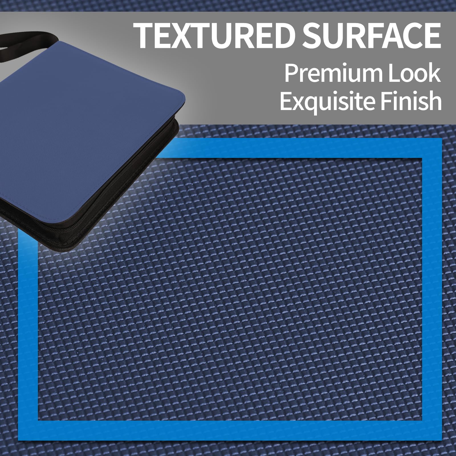 Designed for holding toploaders. The blue exterior and flat spine design delivers a enhanced professional look. Fixed pages ensure smooth flipping while black-background sleeves make your card collection pop with vivid clarity | Compact & Portable: At 11x9 it slides effortlessly into backpacks or handbags-perfect for trading sessions conventions or on-the-go collecting | enhanced Trading Card Binder: Made with heavy-duty water-resistant PU leather. It's tough enough to handle everyday bumps and drops yet stylish | Se3-Sided Zipper: Smooth-gliding zippers wrap around three sides -no slips no dust no worries | 80-Card Capacity: 10 double-sided sleeves (80 pockets total). Load cards back-to-back to maximize space without sacrificing protection