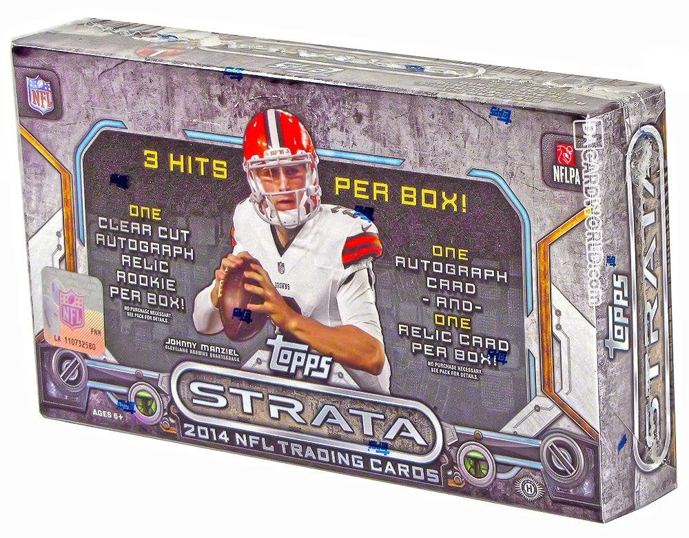 - Q: What is included in a Topps 2014 Strata NFL Trading Cards Hobby Box? A: Each sealed box contains 18 packs, with 6 cards per pack, totaling 108 cards. The set includes 100 veteran cards and 100 rookie cards. Each box guarantees one Relic card, one Autograph card, and one Clear Cut Autograph Relic card.