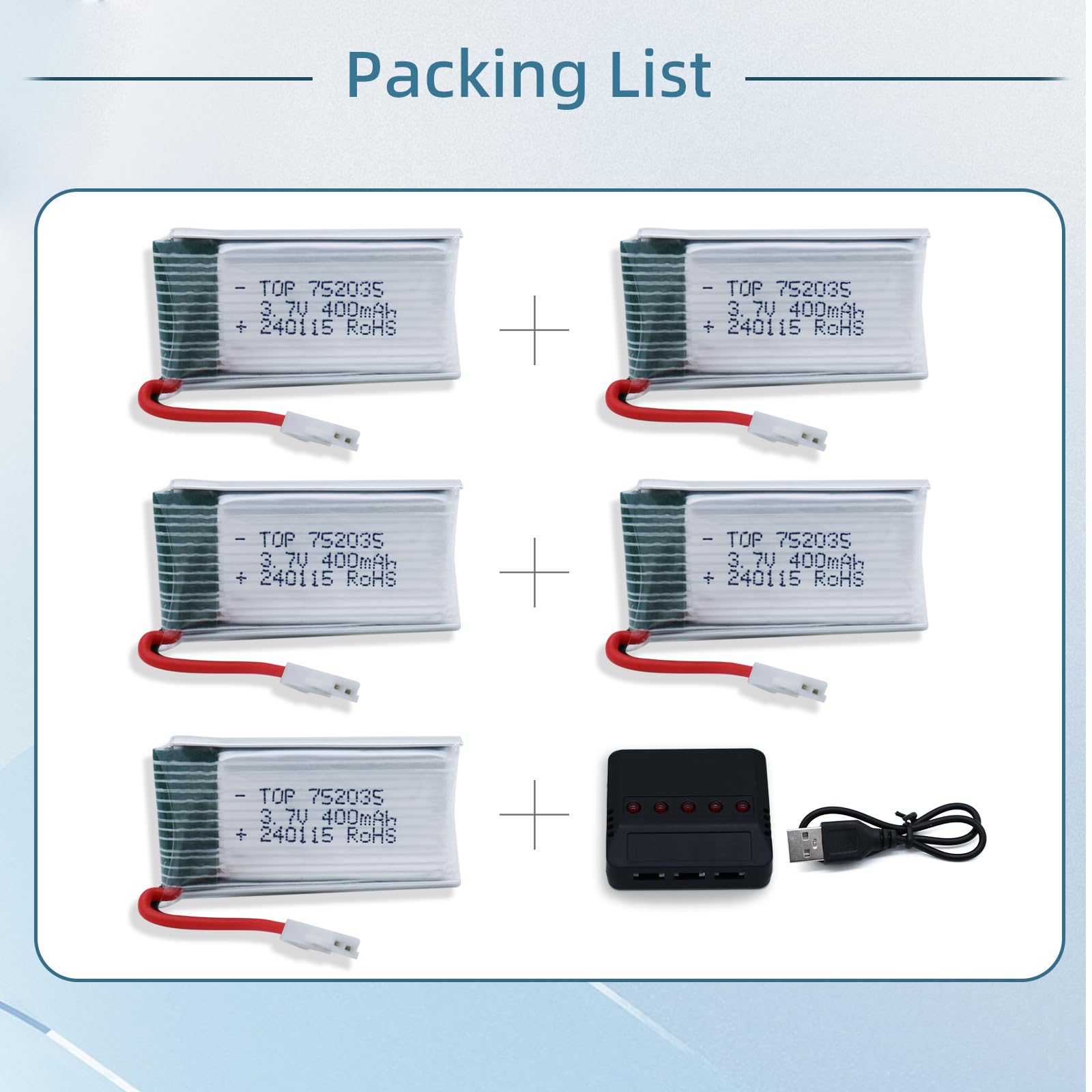 Drone Lipo Battery Suitable for Syma Q11 H99W H31 H6C H98 TR-C385 TR-P51 TR-F22 Quadcopter Part (PLEASE NOTE the voltage/size/plug of the 3.7V lipo battery You will get 5*3.7V 400mAh drone lipo battery, 1*USB cable, 1*charger