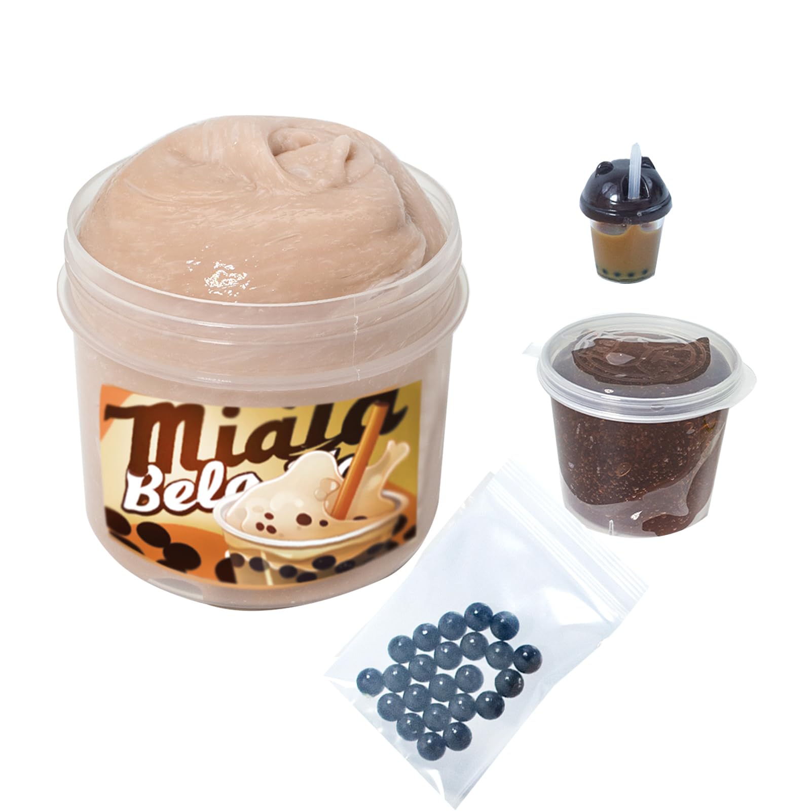 • Q: What materials are used in Tototang Slimes - BUBBLE TEA themed slime? A: The Tototang Slimes - BUBBLE TEA themed slime is made from high-quality PVA, thick base glue, and crystal clear cola gum. It also includes black pearls and exclusive stickers, providing a unique and enjoyable tactile experience.
