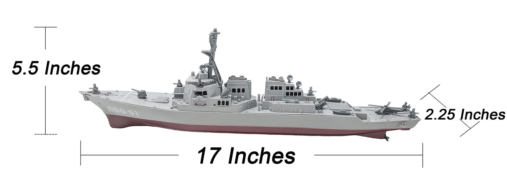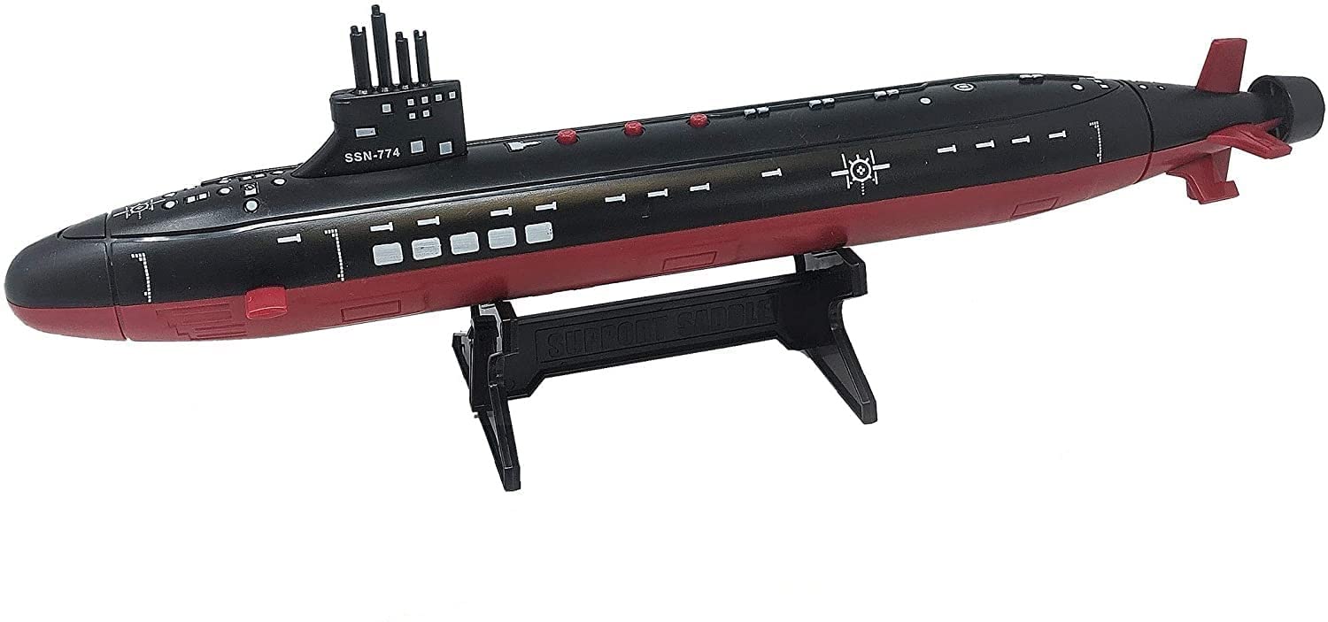 Toy Aircraft Carrier Submarine and Battleship Destroyer Combo with 8 Mini Fighter Jets. Toy Aircraft carrier dimensions: 17.5' x 5.5' x 7'. (LxWxH) Height measures from base of ship to top of satellite. Storage compartment measures: 4.5' x 2' x 2'. Toy Aircraft carrier dimensions: 17.5' x 5.5' x 7'. (LxWxH) Height measures from base of ship to top of satellite. Storage compartment measures: 4.5' x 2' x 2'. Destroyer Battleship (No Sound Effect). Dimensions: 17' x 5.5' x 2.25' (LxWxH). Submarine dimensions: 16.5' x 2.75' x 4' (LxWxH). 5.5' Height with Support Stand. 3 push buttons with different sound effect sounds. 2 AG13 LR44 Batteries Included. Color: Black on top and sides. Red on the bottom. Battery compartment is on bottom side of submarine. Do NOT put in water. Do NOT submerse or float toy.