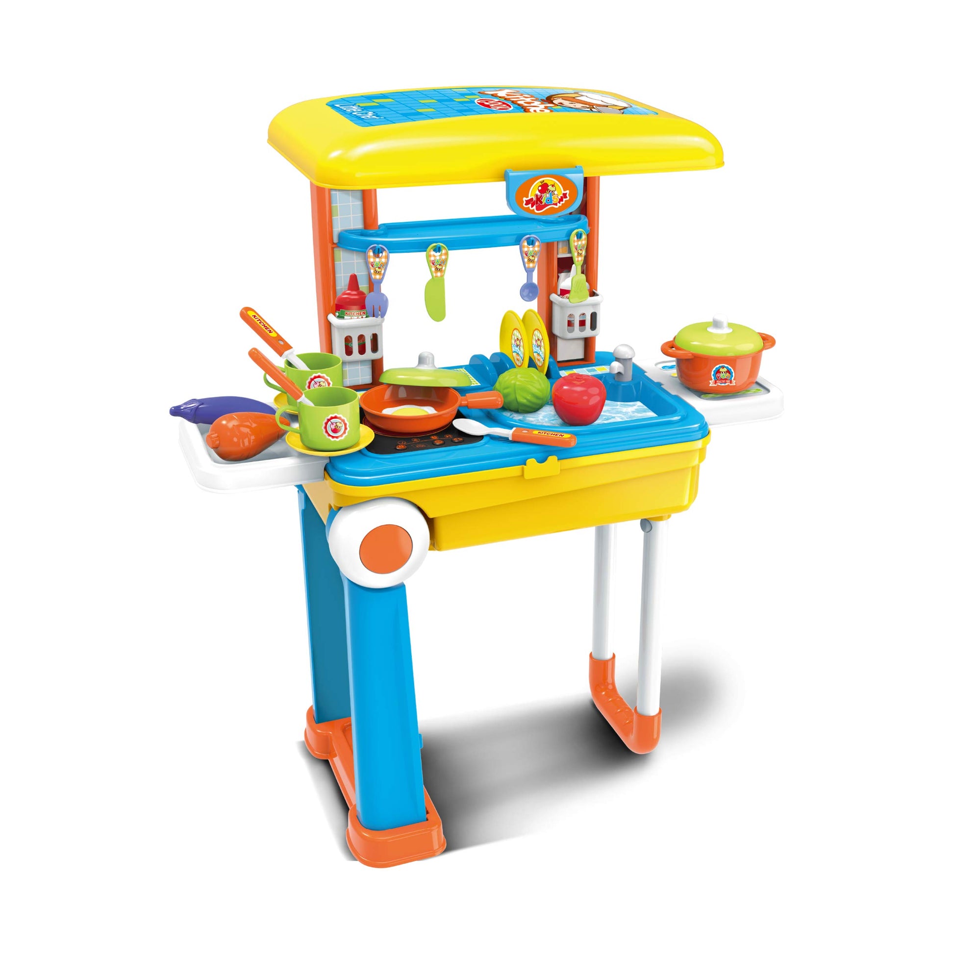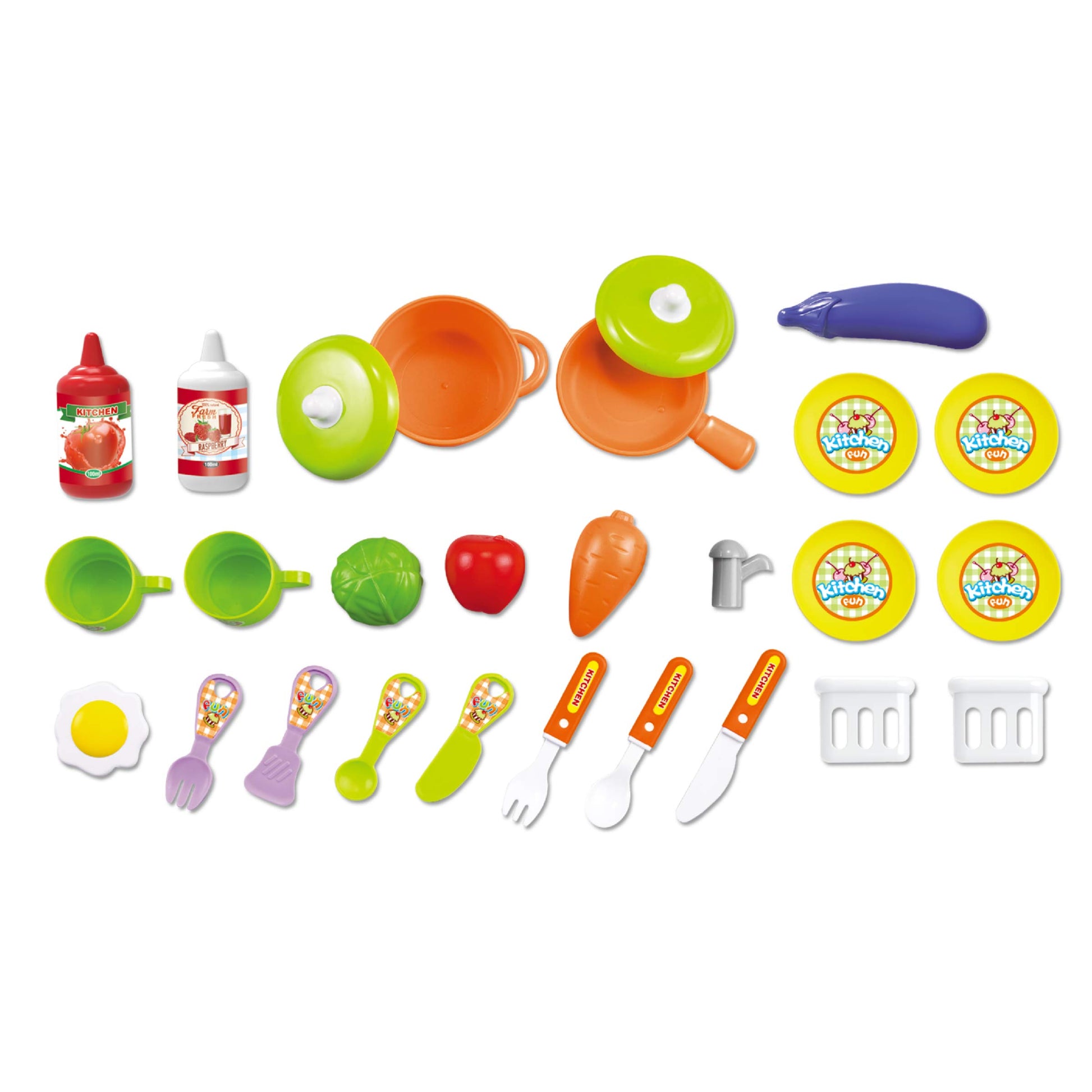 - Q: What items are included in the kitchen set? A: The kitchen set includes toy pots, pans, dishes, utensils, and various realistic food items like fruits, vegetables, and eggs, providing a comprehensive pretend play experience.