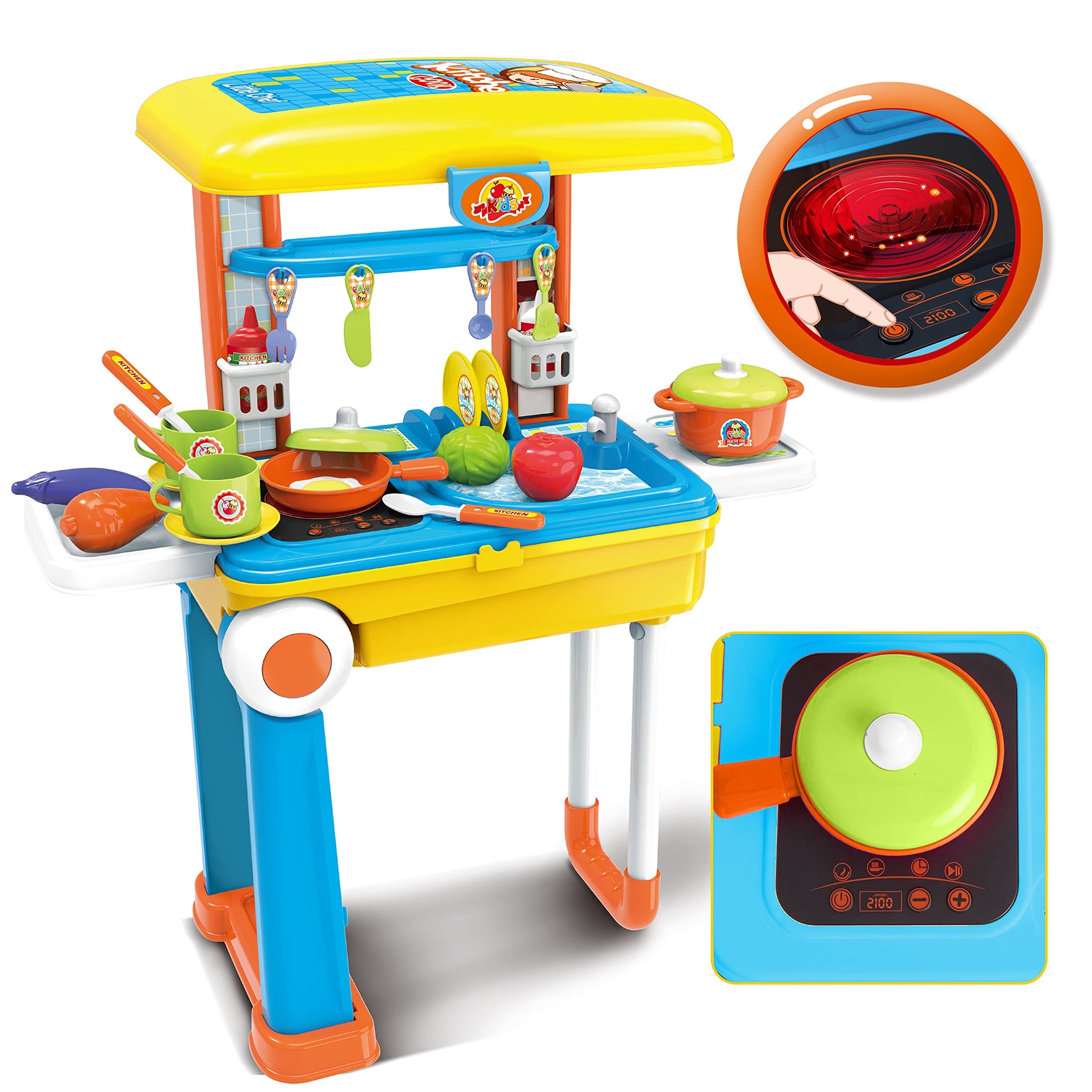 - Q: How does this kitchen set help with child development? A: This kitchen set promotes fine motor skills, hand-eye coordination, and encourages creativity and imagination in children as they engage in pretend play and learn about food and cooking.