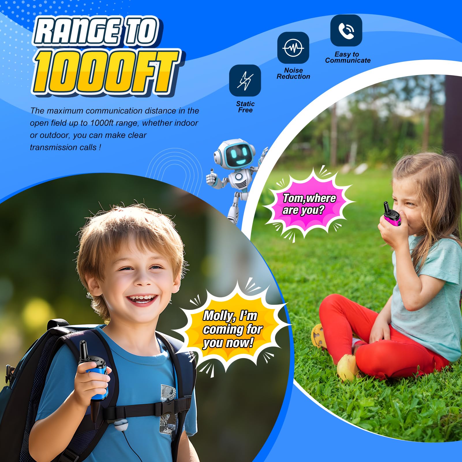 - Q: How far can the walkie talkies communicate? A: These walkie talkies have a communication range of up to 1000 feet in ideal conditions, ensuring that kids can stay connected while playing outdoors.