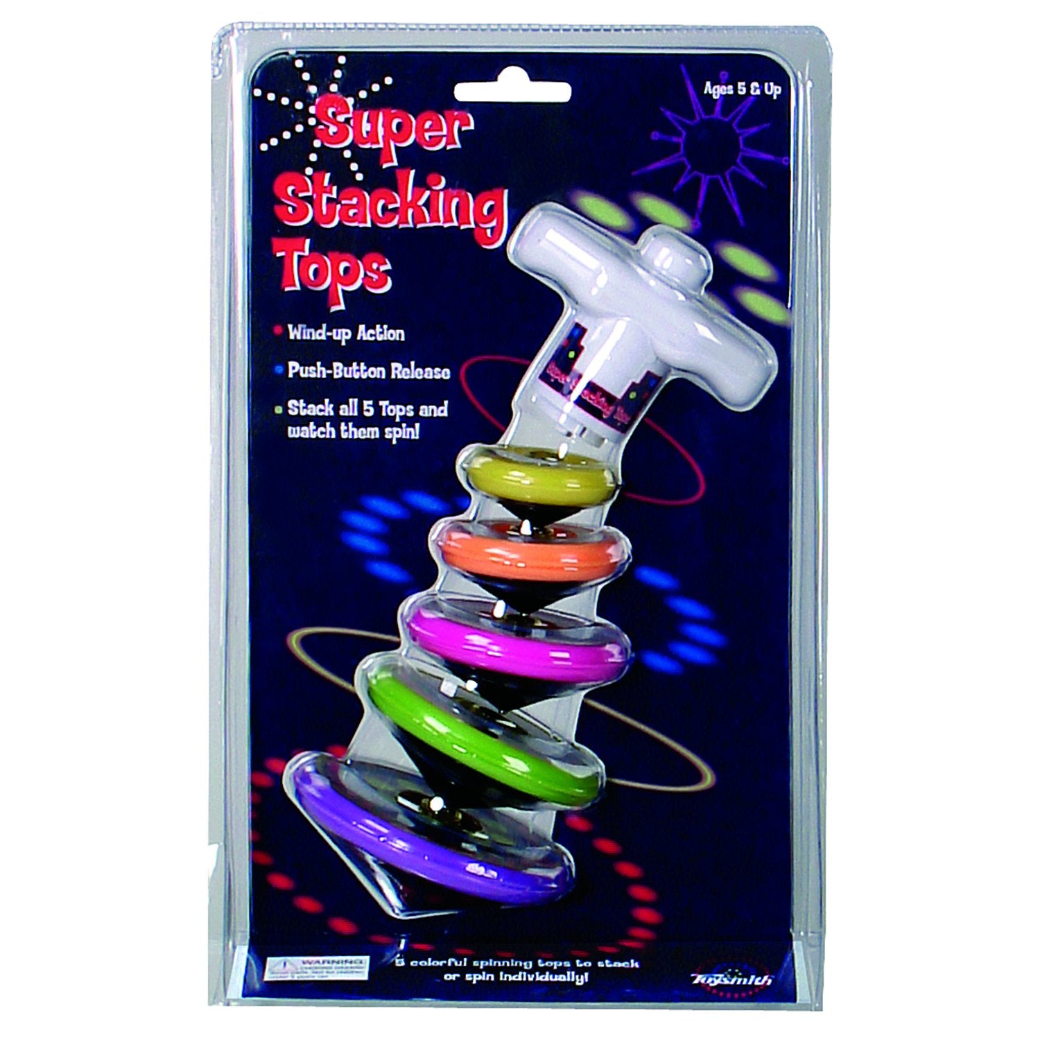 Amaze Your Friends With The Entertaining Toysmith Super Stacking Tops. Relieve Boredom And Experience The Timeless Fun Of Tops With These Colorful Spinners On Their Own Or Stacked Together As A Massive Circulating Tower. A Powerful Wind-Up Handle Will Provide Long Lasting Spinning Action. To Use, Just Find A Flat Surface And Watch The Spinning Action Unfold Before Your Eyes. This Multicolor Set Includes 5 Hard Plastic Tops Of Various Sizes And 1 Starter Handle With A Push Button Release. The Smallest Top Is Approximately 1-Inch In Diameter While The Largest Top Is Approximately 3 Inches In Diameter. Great As A Gift For All Ages, These Tops Will Not Disappoint. Recommended For Ages 3 And Up.