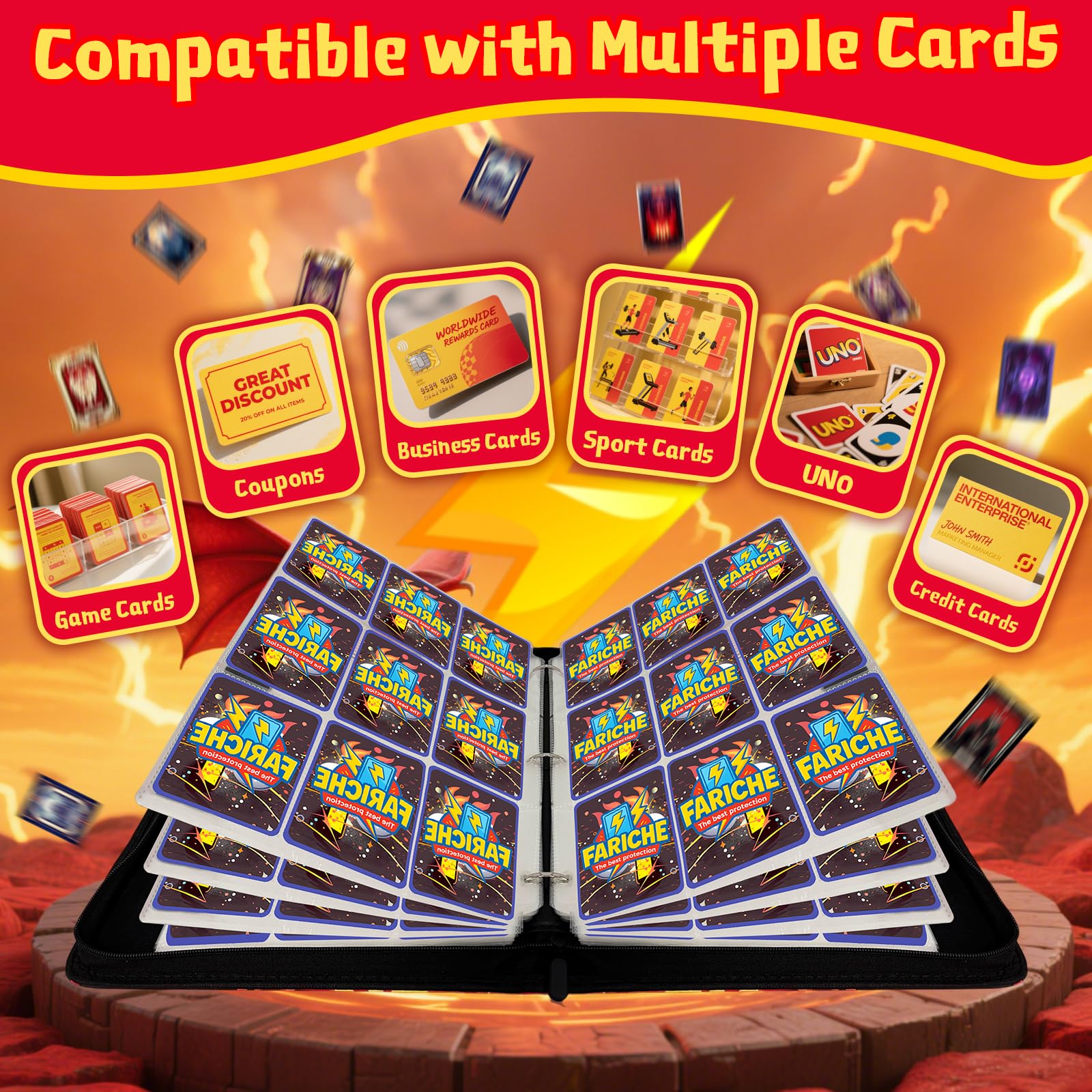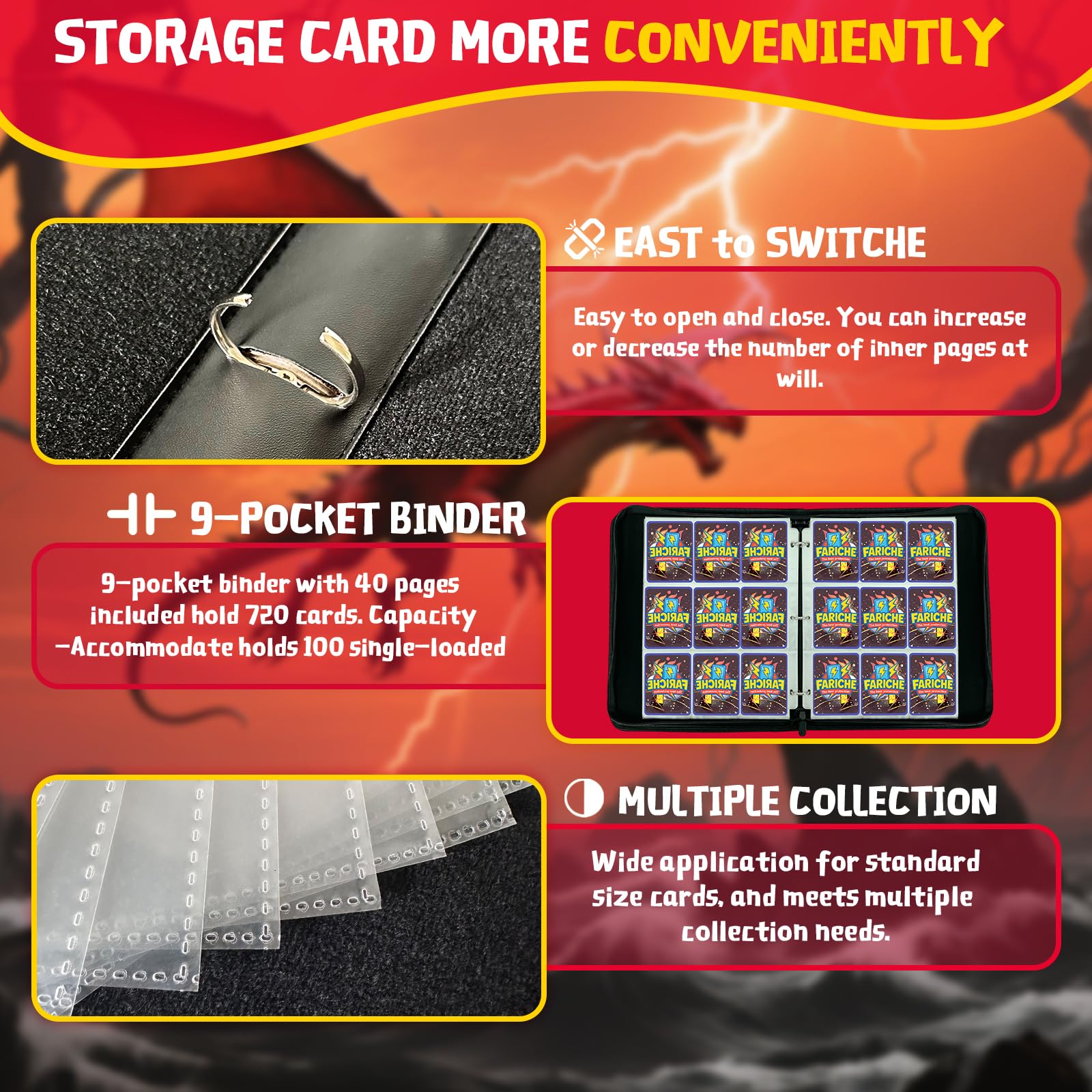 FARICHE 9 Pocket Card Binder for Trading Cards:A must have for cards collection organizing and storing cute and quality binder for kids to carry around get this zipper binder by FARICHE. Features Youll Love:1. 9 pocket card binder for trading cards with PVC-Free EVA foam and PU leather2. Trading card binder holder with plenty of room to hold 720 trading cards3. Carrying binder compatible with trading cards have all cards in the binder and not all over the place4. Trading card binder collectors album compatible with universal standard size trading cards game cards sports cards and more.' Perfect Match Standard Binder :Our baseball card binder collector album holder is great for trading cards keeps your trading cards safe protected and organized! Designed for CollectorsOur 9 pocket card binders are suitable for a variety of Trading Cards Basketball Game Card Baseball Cards MTG Card Game and other collectible cards. A great gift choice for the upcoming birthdays and holidays. SecureQuality zipper seals the binder to keep cards intact when not in use. top-loading pockets prevent your cards from spilling out and keep them safe during transportation. Going to a tournament? enhanced Zip Binders will keep your cards safe and secure. ProtectionOur zipper card binder offer the best protection for your trading cards. Surface is made of waterproof smooth PU which touched very comfortable. Protect your cards from dink dents and scrapes. Keep your valuable cards in mint condition. Packing including:FARICHE 9-Pocket Card Binder for Cards X 1( Up to 720 cards)