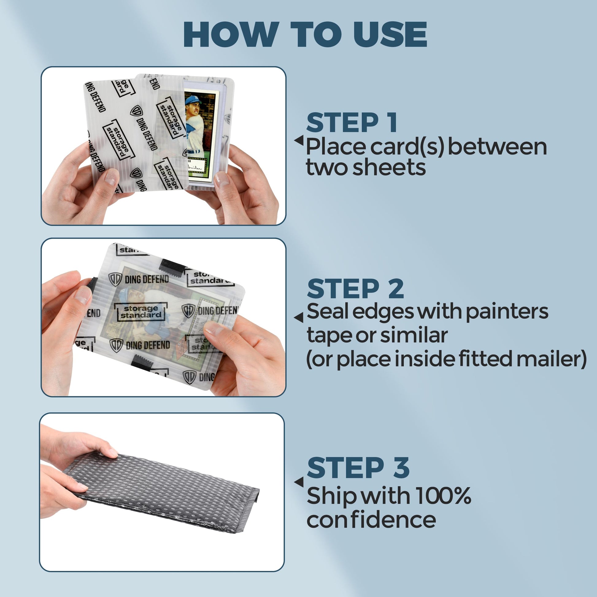 THE ULTIMATE PROFESSIONAL-GRADE COLLECTIBLE CARD SHIPPING SLEEVES. A must-have for breakers or anyone who is sending or shipping cards. Stop wasting your precious time searching for cardboard and cutting pieces and start selling/shipping more cards. If you break or ship any hobby cards such as Magic the Gathering yugioh marvel manga baseball football basketball hockey and sport Ding Defense sleeves are a necessity. Strong thin blanks but padded plastic material is much stronger than cardboard chipboard. Slim enough to easily fit into a standard envelope. Thick enough to protect from dings. The hard surface is designed for use with toploaders and thin holders. Ding Defend innovative padded plastic material is stronger thinner and more effective than paper cardboard. Directions for use: 1. Place card(s) centered in two protective sheets 2. Seal edges with painters tape or similar (or place inside a fitted mailer or graded sleeve) 3. Ship with 100% confidence. Ship with 100% professionalism.