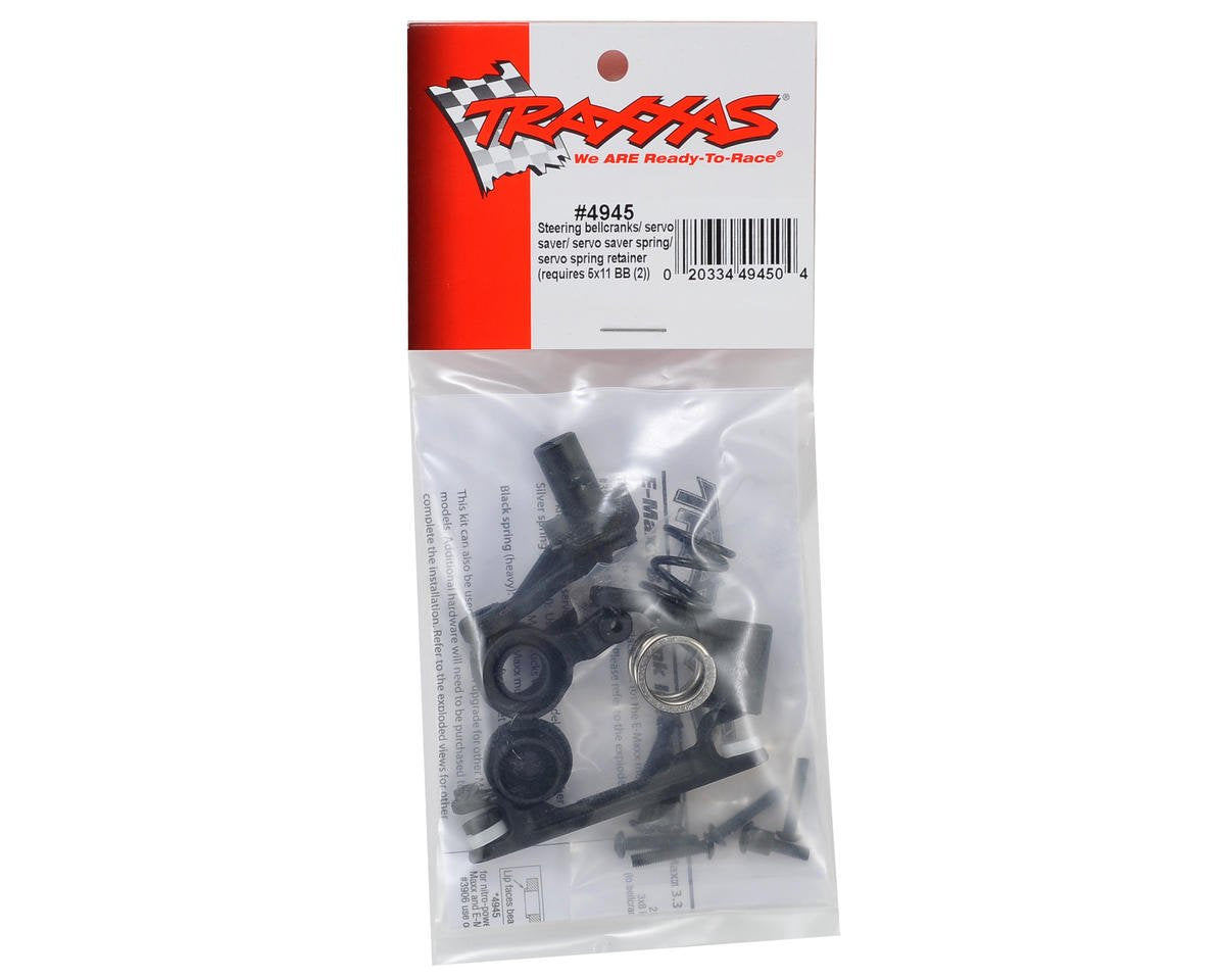 - Q: What are the key components included in the Traxxas 4945 Steering Bellcranks E-Maxx? A: The Traxxas 4945 Steering Bellcranks E-Maxx package includes a pair of steering bell cranks, a servo saver, a servo saver spring, and a servo spring retainer. It also requires two 5x11mm ball bearings for complete installation.