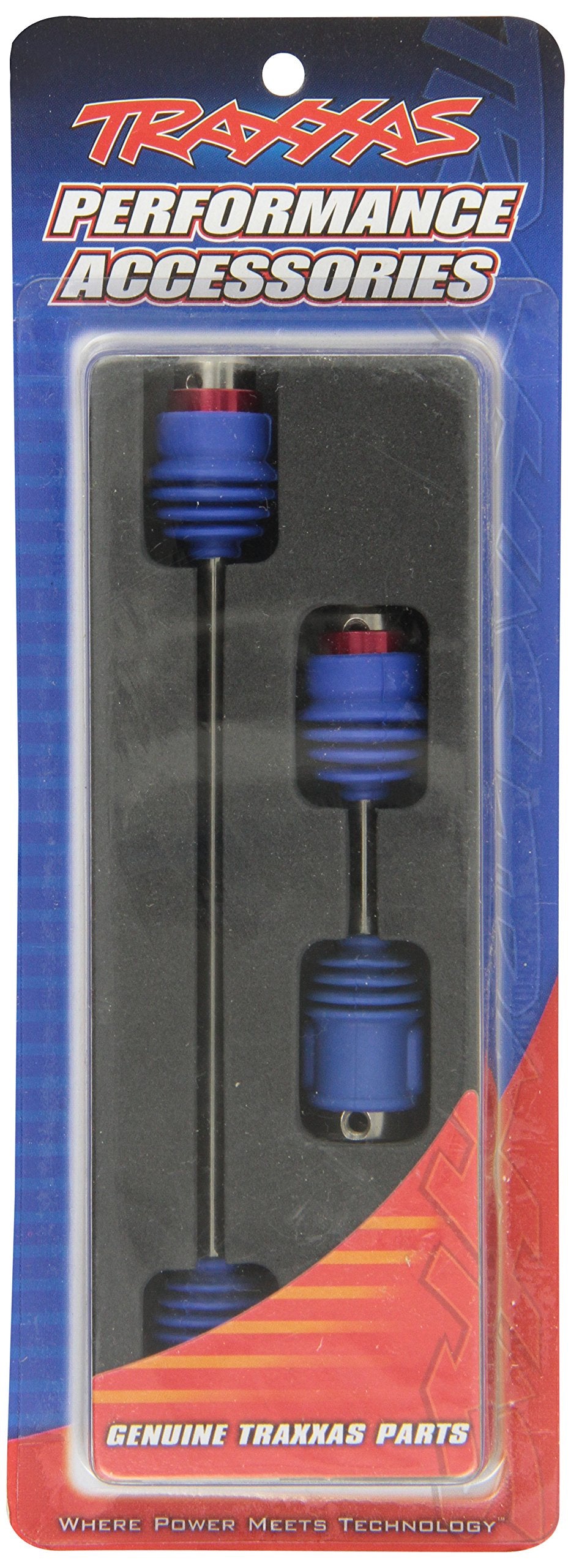 • Q: What materials are used in the construction of these driveshafts? A: The Traxxas 5650R driveshafts are constructed from nickel-plated steel for strength, with blue silicone boots and red-anodized aluminum accents, providing both durability and a visually appealing design.