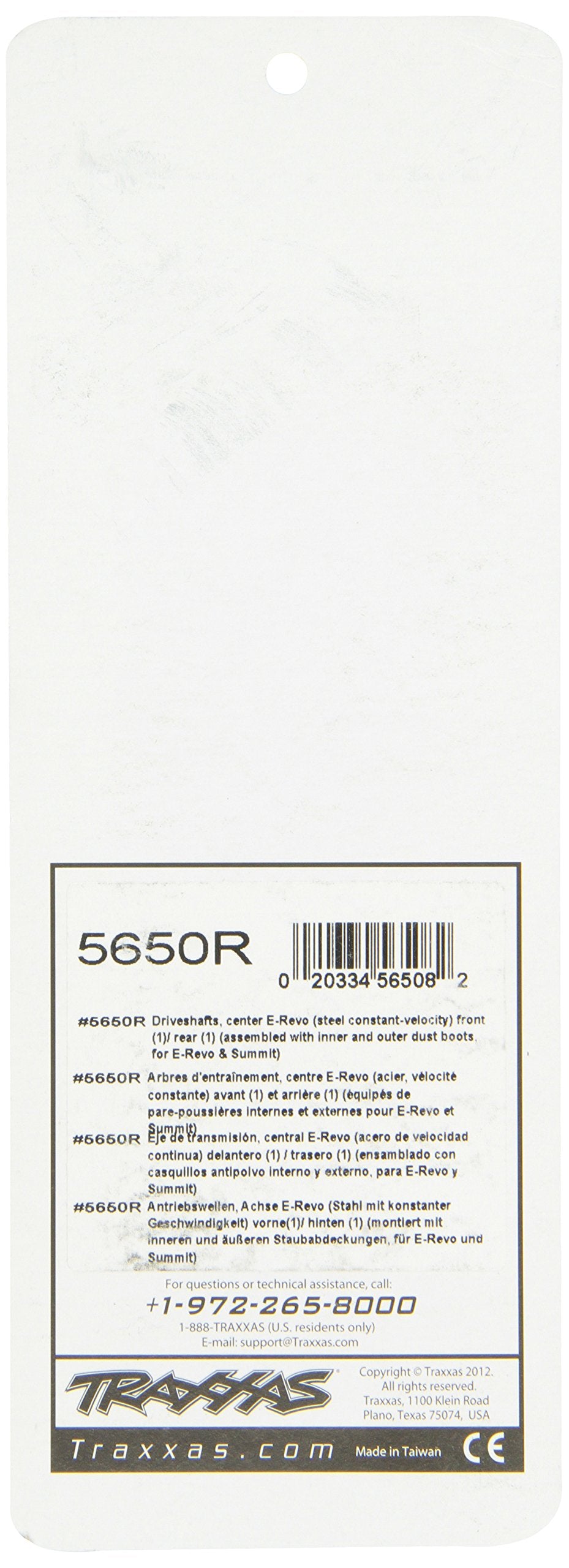 Product DescriptionDriveshaft's, center E-Revo (steel constant-velocity) front (1)/ rear (1) (assembled with inner and outer dust boots, for E-Revo & Summit) Traxxas Steel Constant Velocity Driveshaft's are designed to handle the extreme horsepower and torque that Summit, E-Revo, and E-Revo Brushless Edition dish out. The inner and outer U-joints are lubricated and sealed by a rubber boot for maximum protection against the elements, and the U-joint pins are held captive by a lightweight aluminum sleeve so you never have to worry about losing a pin. The nickel plated steel shafts, blue silicone boots, and red-anodized aluminum accents not only look good, they are designed to exacting specifications for ultimate strength and performance. These are simply the most advanced steel CV driveshafts available. Complete kit includes front and rear driveshafts, ready to install. Fits E-Revo, Summit, and E-Revo Brushless Edition.From the ManufacturerConstant Velocity Center Shafts: Traxxas Steel Constant Velocity Driveshafts are designed to handle the extreme horsepower and torque that Summit, E-Revo, and E-Revo Brushless Edition dish out. The inner and outer U-joints are lubricated and sealed by a rubber boot for maximum protection against the elements, and the U-joint pins are held captive by a lightweight aluminum sleeve so you never have to worry about losing a pin. The nickel plated steel shafts, blue silicone boots, and red-anodized aluminum accents not only look good, they are designed to exacting specifications for ultimate strength and performance. These are simply the most advanced steel CV driveshafts available. Complete kit includes front and rear driveshafts, ready to install. Fits E-Revo, Summit, and E-Revo Brushless Edition.