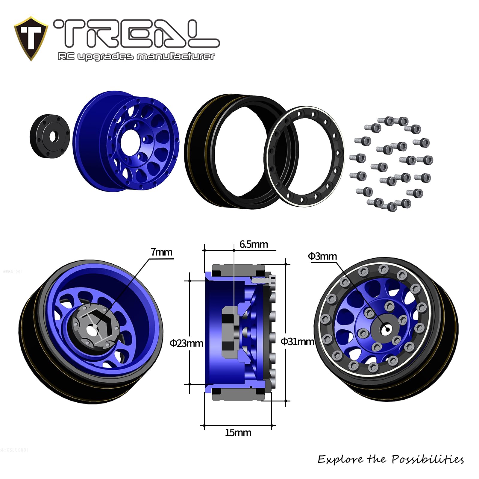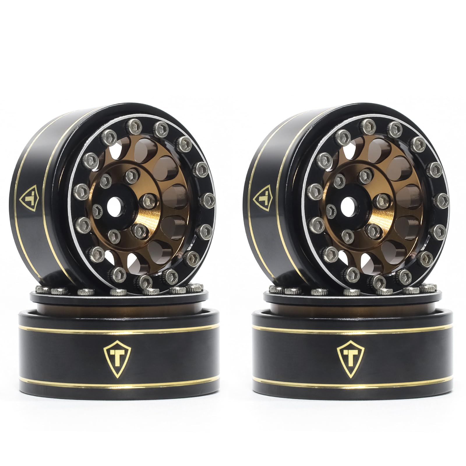 Fits SCX24 Bronco Gladiator C10 Deadbolt, AX24, FCX24, TRX4M. | Crafted from high-quality material, making the wheels incredibly durable and able to withstand rough terrains and demanding off-road conditions. | Coming with a set of extra extended wheel hubs. | Brass rings (balck coated),the additional weight of the brass material helps increase traction and stability, providing better grip on various surfaces, which is especially beneficial for rock crawling and challenging trails. | These wheels are designed with meticulous attention to detail to replicate the look of full-scale beadlock wheels, adding a realistic touch to your RC vehicle.
