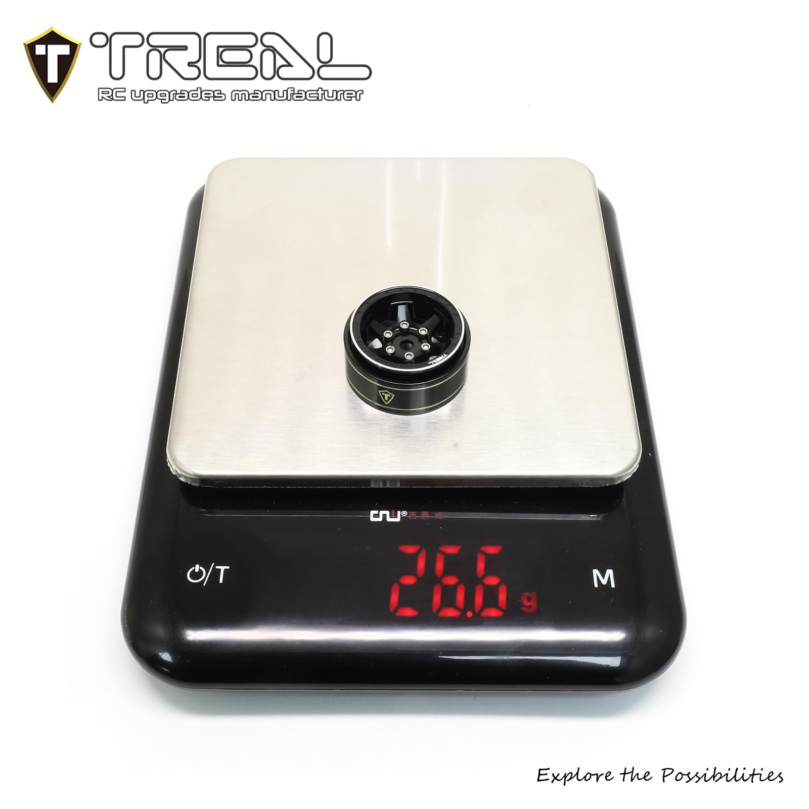 - Q: What is the weight of each TREAL SCX24 Wheel? A: Each fully assembled TREAL SCX24 Wheel weighs approximately 26.6 grams (0.058 lb), making them lightweight yet durable for optimal crawler performance.