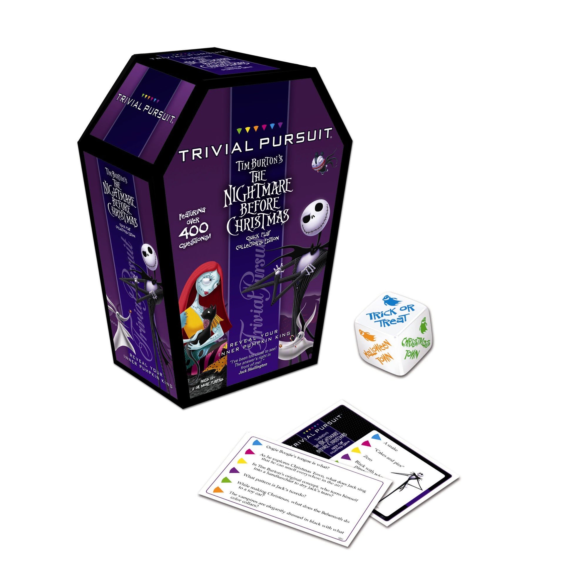 - Q: What is included in the TRIVIAL PURSUIT: Tim Burton's The Nightmare Before Christmas game? A: The game includes a custom coffin-shaped box, a tray that holds the trivia cards, a custom die, and 400 trivia questions related to the film's songs, characters, and behind-the-scenes facts.