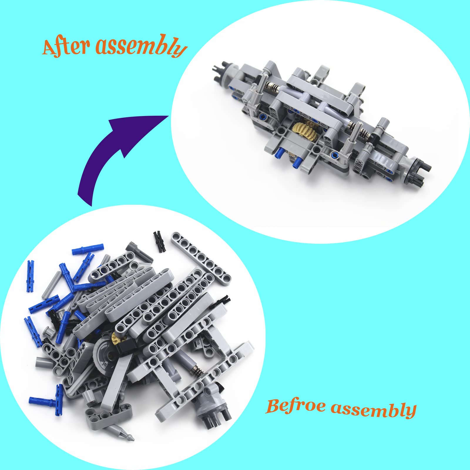 - Q: What types of parts are included in the TTLYHEK Technical Parts Set? A: This set includes various technical components such as gear differentials, gearboxes, beams, rack and pinion systems, chain links, and shock absorbers, providing a wide range of options for creative building.