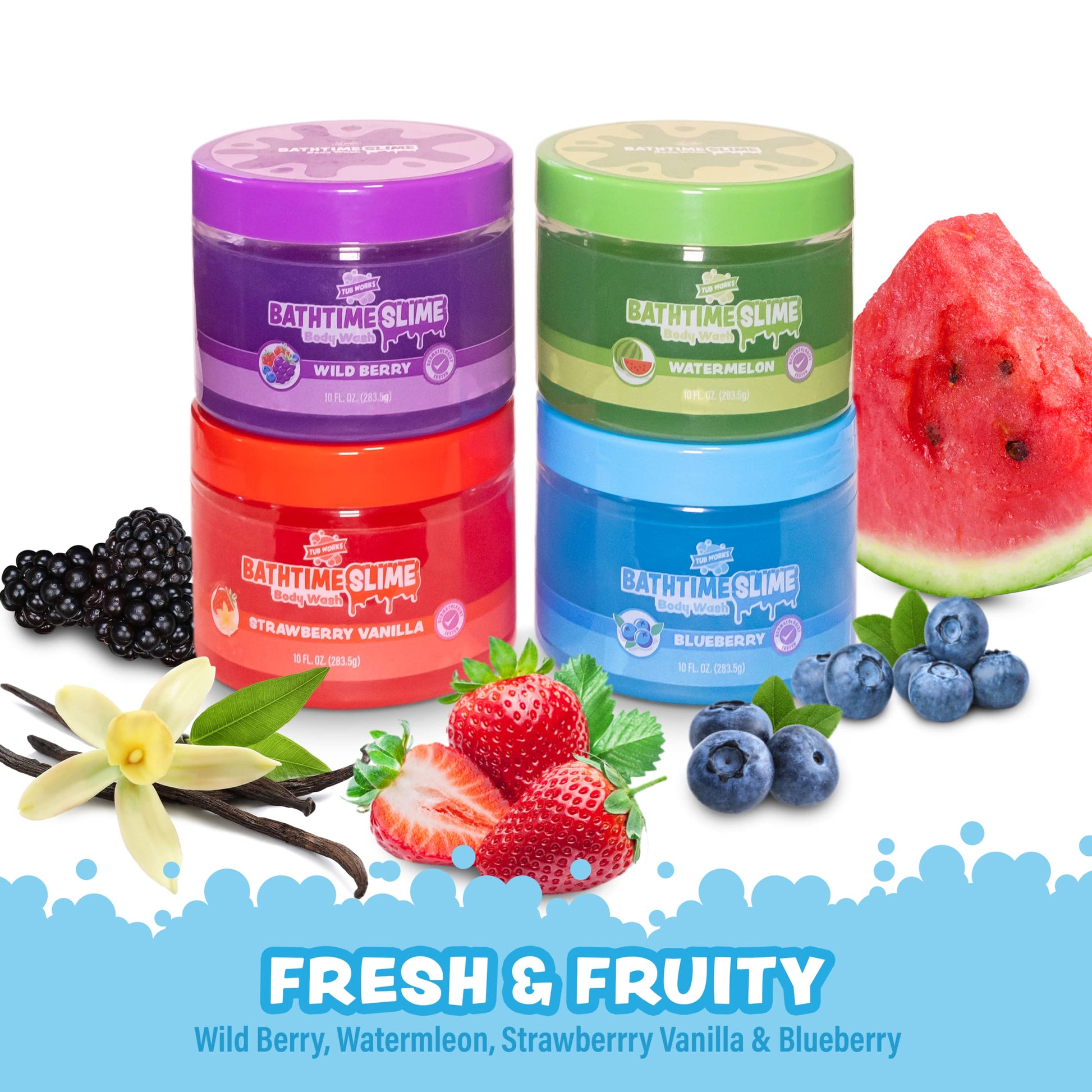 - Q: What are the scents included in the Tub Works® Bath Slime Kids Body Wash Variety Pack? A: The Variety Pack includes four fun scents: Strawberry Vanilla, Blueberry, Wild Berry, and Watermelon, making bath time enjoyable for kids.