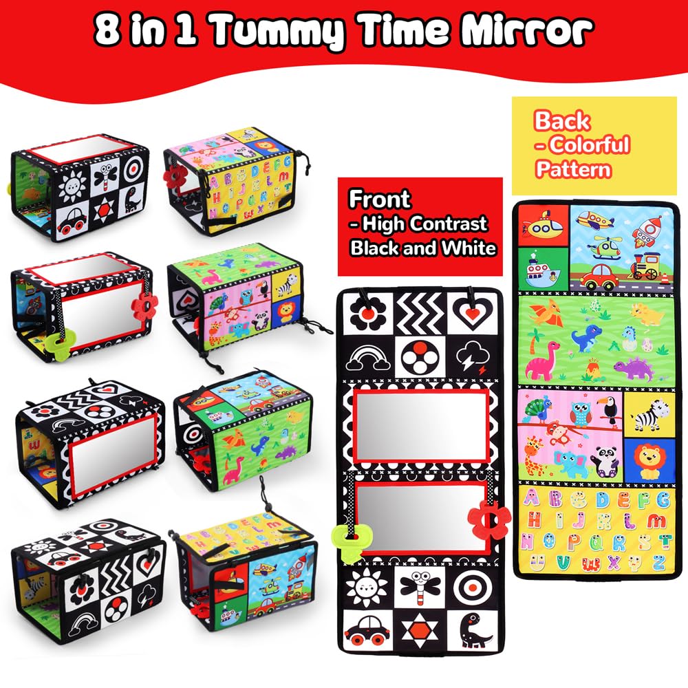Tummy Time Floor Mirror With Crinkle Cloth Book And Teethers, Double-Sided Baby Mirror High Contrast Black And White Baby Toys, Folding Crawling Activity Mat Floor Mirror For Infants 3 6 12 Months