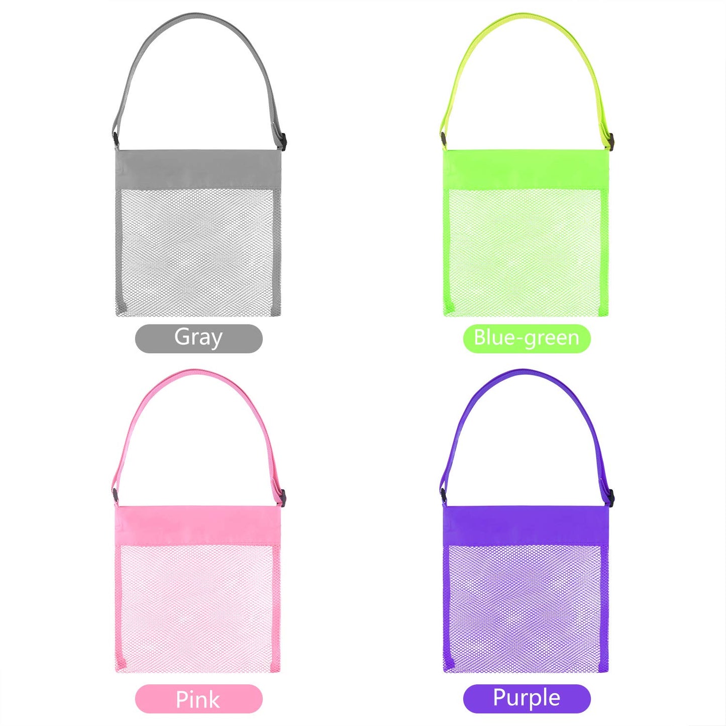 Packing: Includes 4 mesh beach bags, one in each color of blue-green, pink, gray, and purple. Size: 22cm/8.7inch x 21cm/8.3inch Features: 1.Adjustable straps suitable for adults and children. 2.The design of the mesh helps to drain sand and water,also helps to ensure visibility. it's also easy to clean, just wash it by hand and hang it out to dry. 3.Our beach bag is made of good quality material, strong, perfect for collecting seashells or beach toys while walking on the beach.