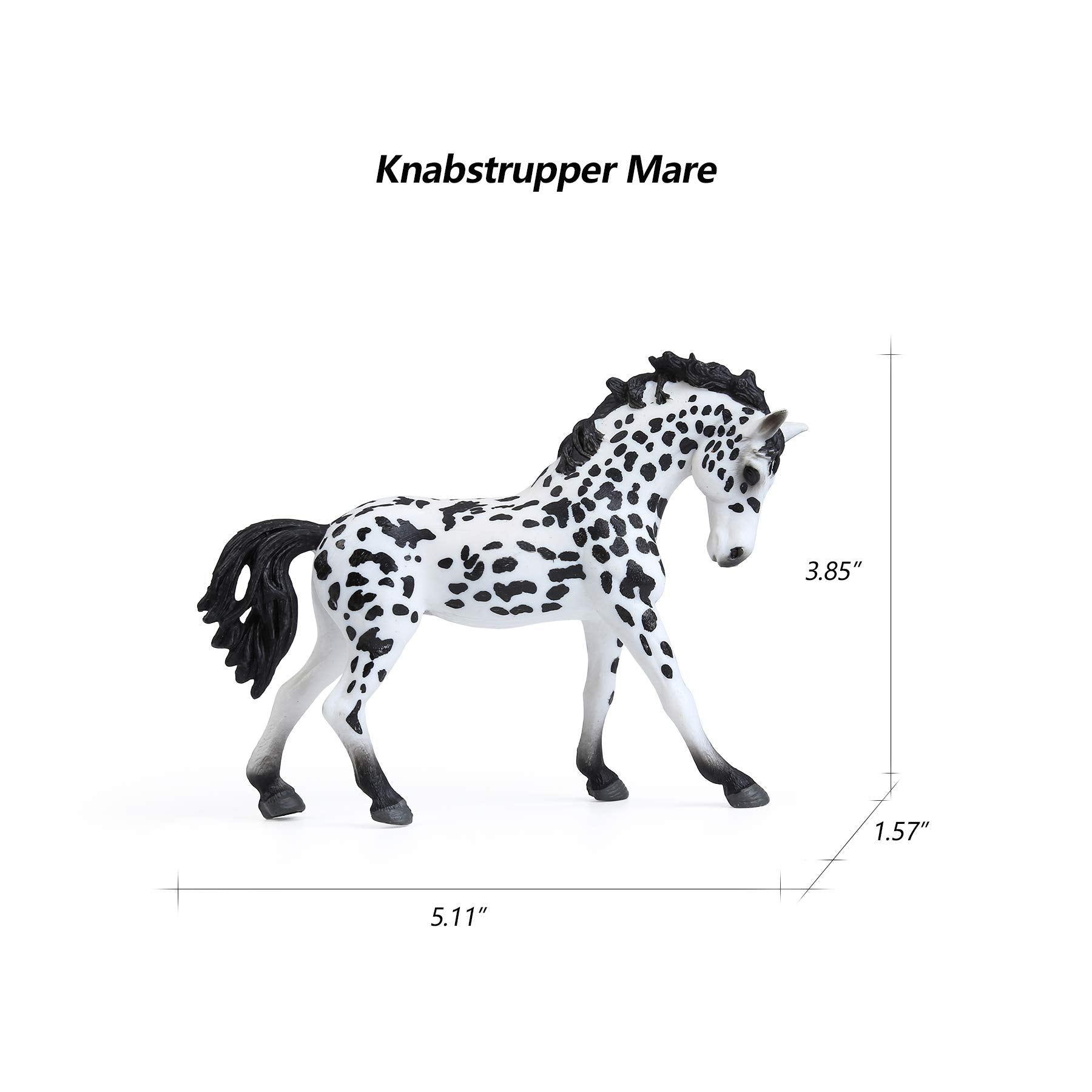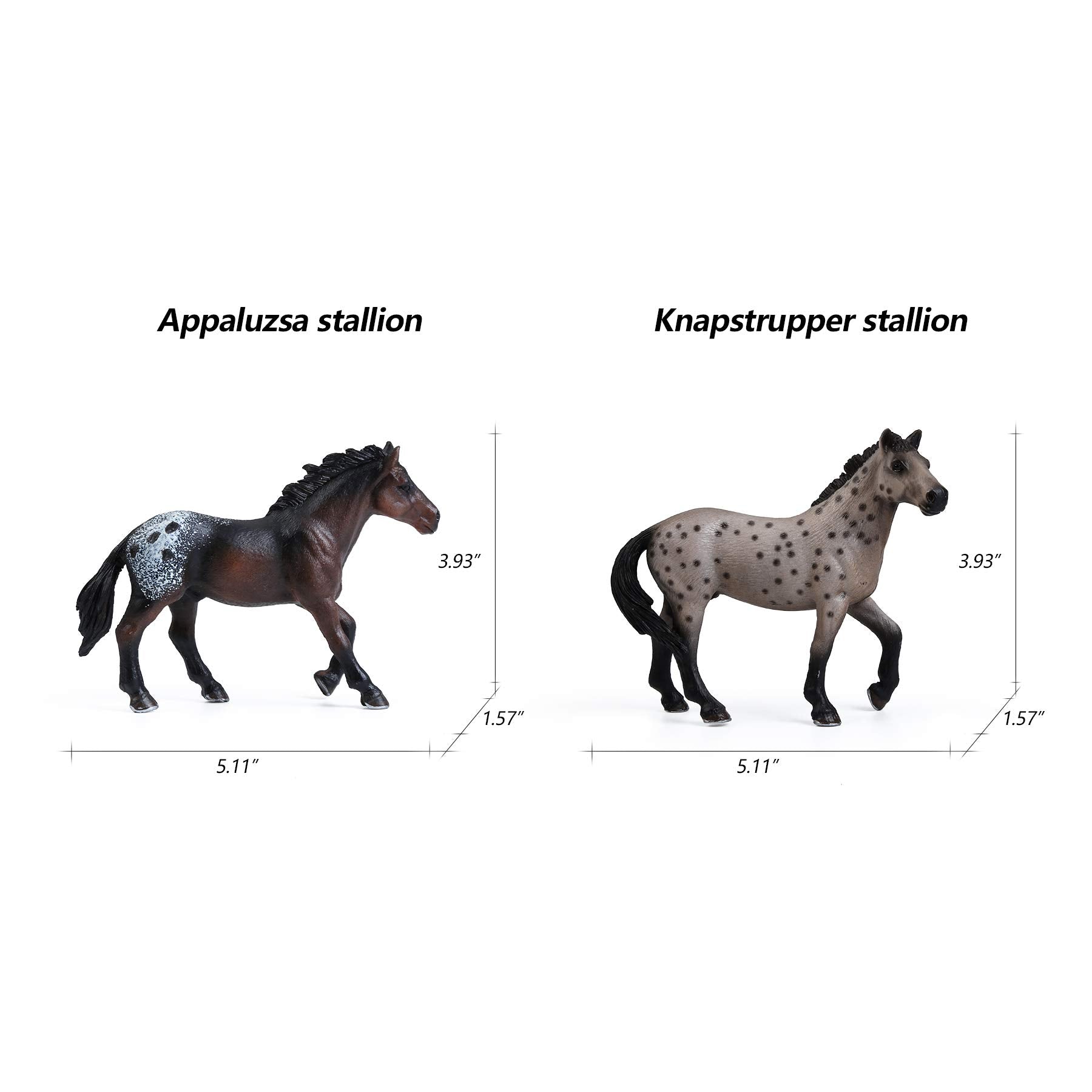 - Q: What sizes are included in the 8PCS horse toy set? A: The 8PCS horse toy set includes various sizes: Pinto Stallion (approximately 5.62"L x 2.36"W x 4.52"H), Knabstrupper Mare (5.11" x 1.57" x 3.85"), Appaloosa Stallion (5.11" x 1.57" x 3.93"), Knabstrupper Stallion (5.51" x 1.57" x 3.93"), Andalusian Mare (4.92" x 1.57" x 4.13"), Frisian Mare (4.92" x 1.57" x 4.13"), Hanoverian Mare (5.59" x 1.57" x 4.05"), and Tennessee Mare (5.11" x 1.96" x 3.93").