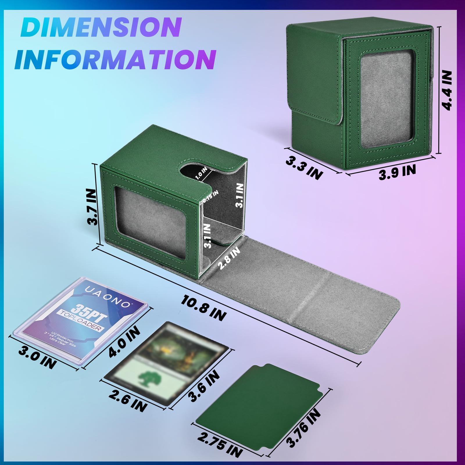Extensive Compatibility: Perfectly Compatible With Magic The Gathering,Dragon Shield,Yugioh, Star Wars X-Wing, Game Of Thrones, Wow, Force Of Will, Legend Of The Five Rings, Cardfight Vanguard, Duel Masters, Panini Football , Baseball Football Basketball Cards Along With Many More Collectible Card Games . Specifications: Material: Pu Leather Color: Green, Gray Size: 3.2*3.1*4.1 Inch Package Includes: 1 X Card Deck Box 1 X Top Loader 2 X Card Dividers Notes: Manual Measurement, Please Allow Slight Errors On Size. The Color May Exist A Slight Difference Due To Different Screen Displays. If You Are At All Unsatisfied With Your Purchase, Please Contact Us Right Away And We Will Listen To Your Concerns And Our Customer Service Team Will Come Up With The Best Solution For The Situation.
