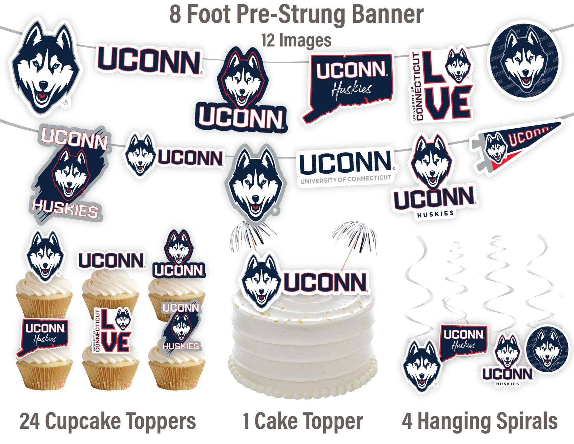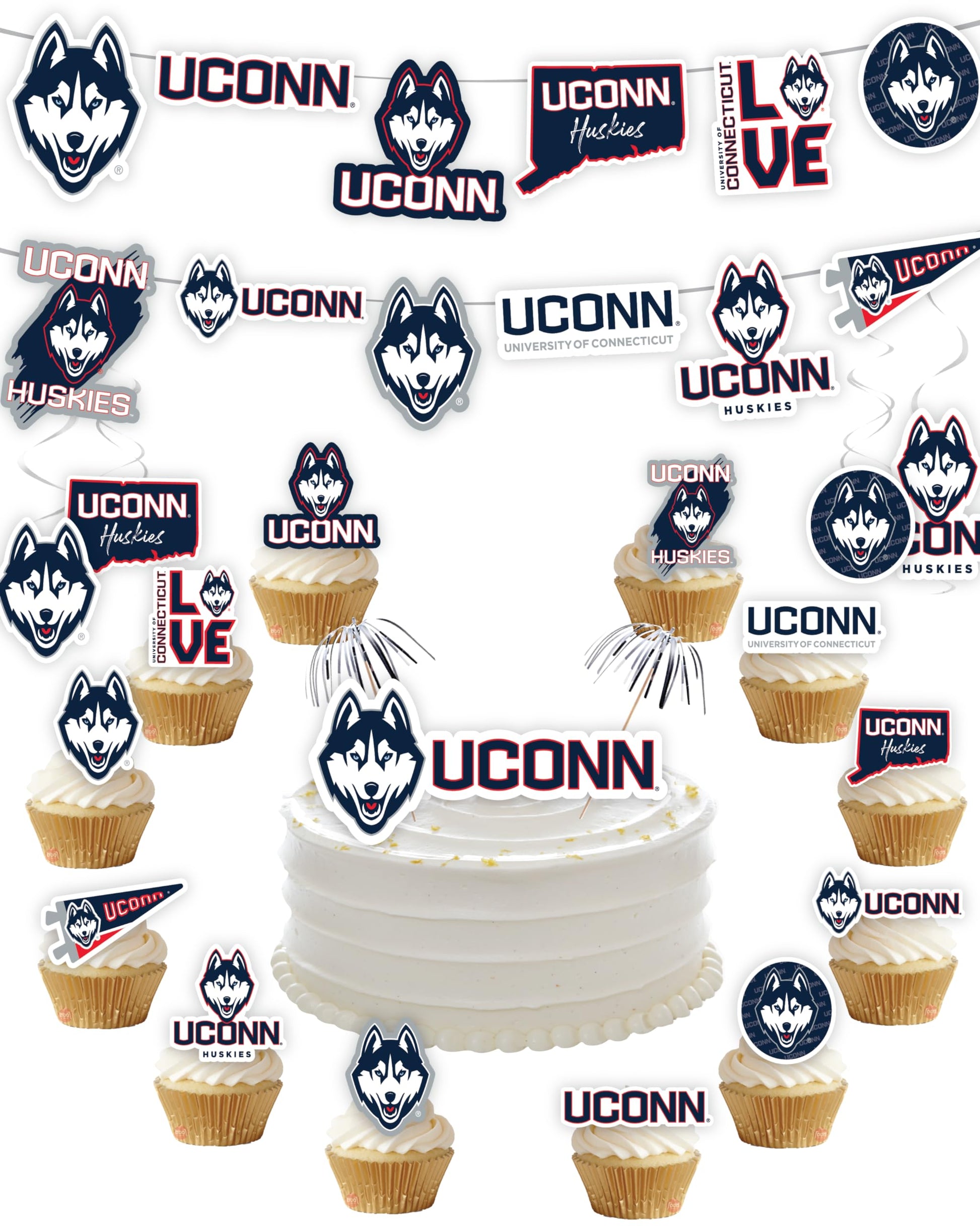 - Q: How many pieces are included in the UConn Huskies Party Supplies set? A: The UConn Huskies Party Supplies set includes a total of 42 pieces, which consists of an 8-foot pre-strung banner, a cake topper with pompom tassels, 24 cupcake toppers, and 4 party swirls.
