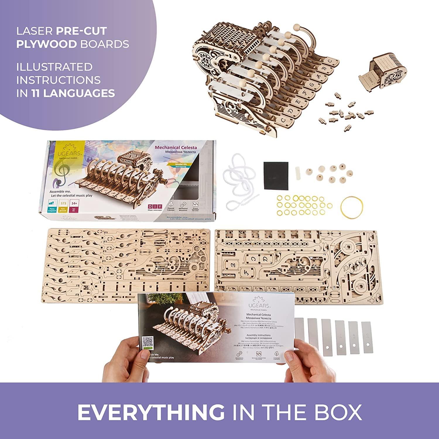 - Q: What materials are used in the Mechanical Celesta puzzle? A: The Mechanical Celesta puzzle is made of wood. It features laser-cut wooden pieces that fit together without glue.