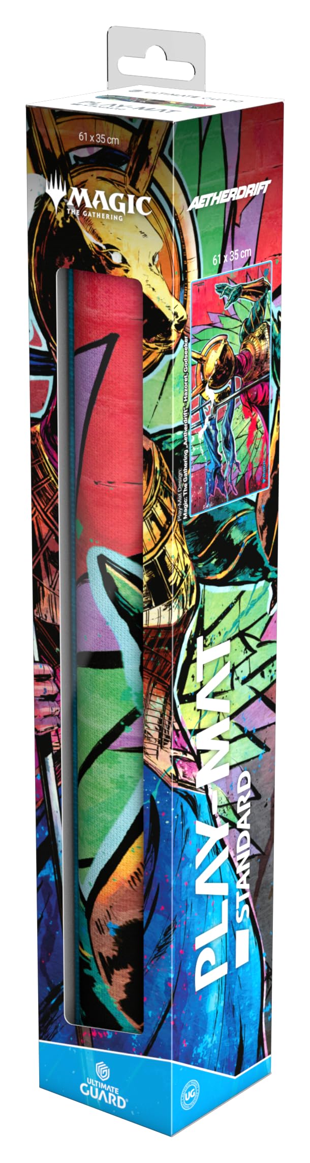 The 61x35cm Play-Mat protects cards and sleeves while playing and improves the gaming experience thanks to its anti-slip underside, while the stitched edges guarantee an even longer service life. The top side of the Play-Mat is printed with officially licensed artworks from Magic: The Gatherings upcoming set Aetherdrift .