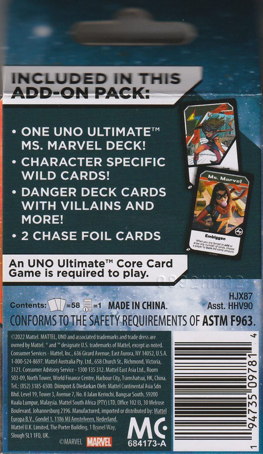 • Q: What is included in the UNO Ultimate Marvel Ms. Marvel Add-On Pack? A: The UNO Ultimate Marvel Ms. Marvel Add-On Pack includes an entire deck of UNO Ultimate cards featuring graphics and special rules tailored for the Ms. Marvel character, as well as two collectible Foil Cards.