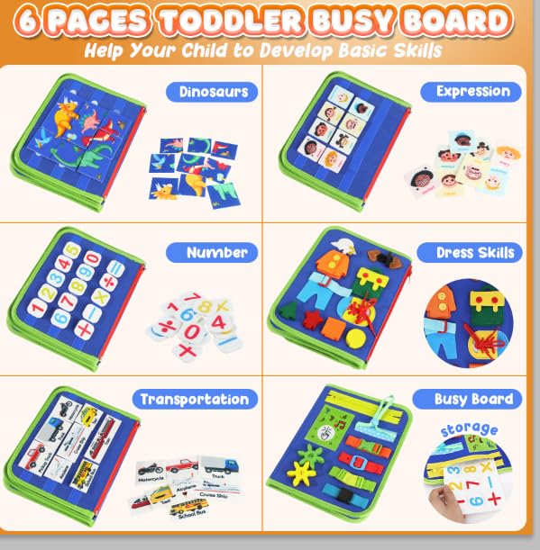 - Q: What activities are included in the busy book? A: The busy book features multiple activities, including sorting and matching DIY puzzles related to dinosaurs, math, emotions, and vehicles, designed to develop fine motor skills and cognitive abilities.