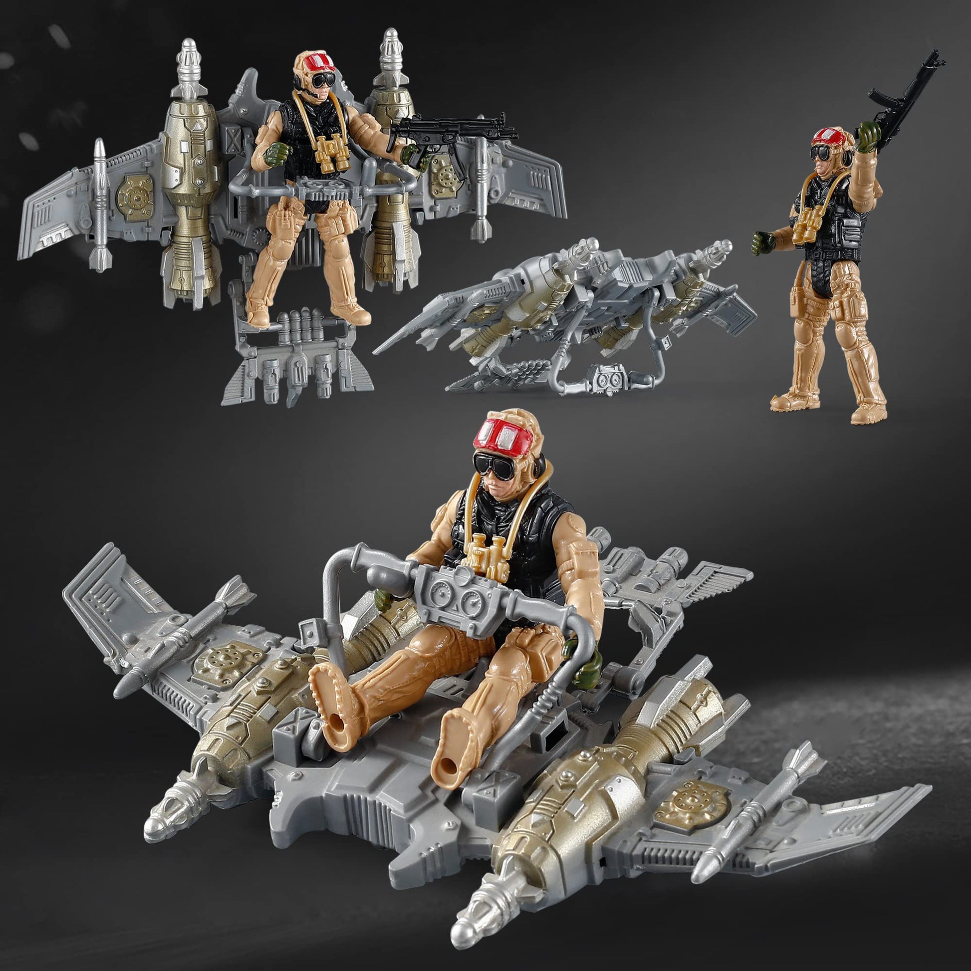 well-made army men toy soldiers playsets for your boys and girls.We are expecting your kids play with these things happily for hours. Need time to clean your house read a book eat some bonbons? Buy these!Why should it be worth the choice?A. LOTS OF PIECES - Various army figures military weapon accessories and military vehicles.More fun with a variety of combinations.B. RARE - 4 independent action figures inclue 2 U.S. Army Soldiers and 2 U.S. Air Force Soldiers.Well made and good details.C. well-made - The toy soldiers set are made of well-made environmental plastic material safe to play.D. The best choice for the military collection.Great for kids with imagination.Package :4 action figures 2 war dogs 1 military glider 2 battlefield motorcycle 1 raft boat 2 binoculars 4 s 1 communications instrument 1 laptop 2 wire netting 2 road barriers 1 railing.Order today 100% Risk Free. 90 Day Return. We stand behind our children toys.