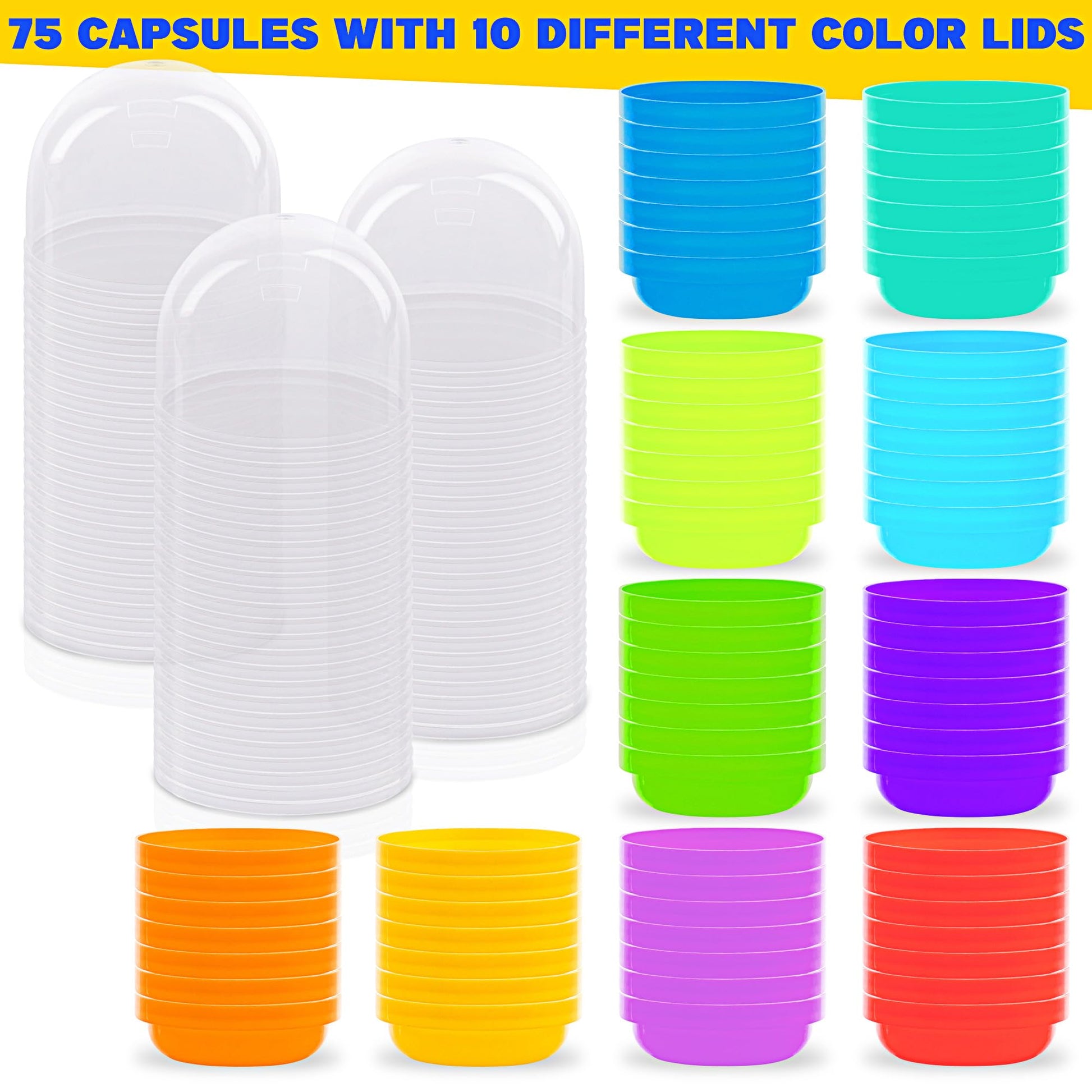 GRAB THEIR ATTENTION WITH AMAZING DISPLAYTurn HeadsLittle capsules that make for lots of compliments! Whether youre looking for cute containers for candy, miniature toys, or small prizes, these 2 capsules underscore the goodness with attention-grabbing aesthetics. Weve complemented the acorn-shaped containers with colorful lids sporting everything from bright orange, pink, red, yellow, blue, green, to purple hues. Every pack comes with a SET OF 75 to give you enough to dish around.Discover the VersatilityThere is so much you can do with these 2 capsules. Throwing a birthday party? Use them as favor containers to dish out delicious candy. Want to introduce color to any space? Fill them with cute trinkets and place them on shelves and desk for epic d cor. Looking for unique craft accessories to keep kids busy and bursting with creativity? Use the capsules as craft items, let the kids imagination run wild, and watch them create amazing pieces theyll live to treasure.Heres why youll love these capsules: ?Come in a pack of 75 to give you great value. ?Include colored lids in a variety of bright hues.?Measure 2 in diameter to fit small toys and goodies. ?Made of durable plastic with securely fitting lids.?Can be used as craft items, display containers, or d cor pieces. o ahead, accentuate little treats with lots of personality!
