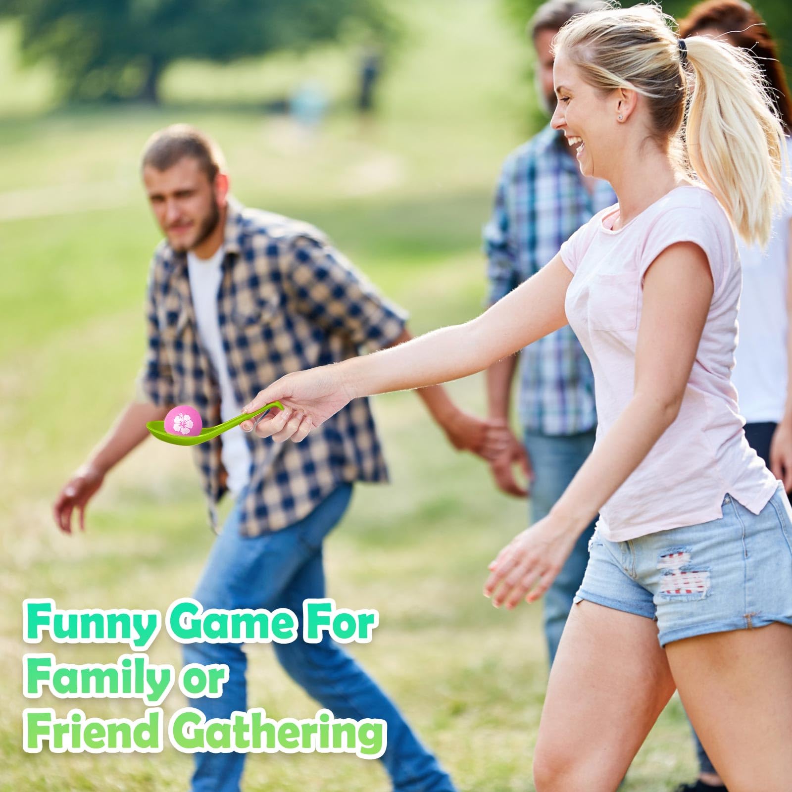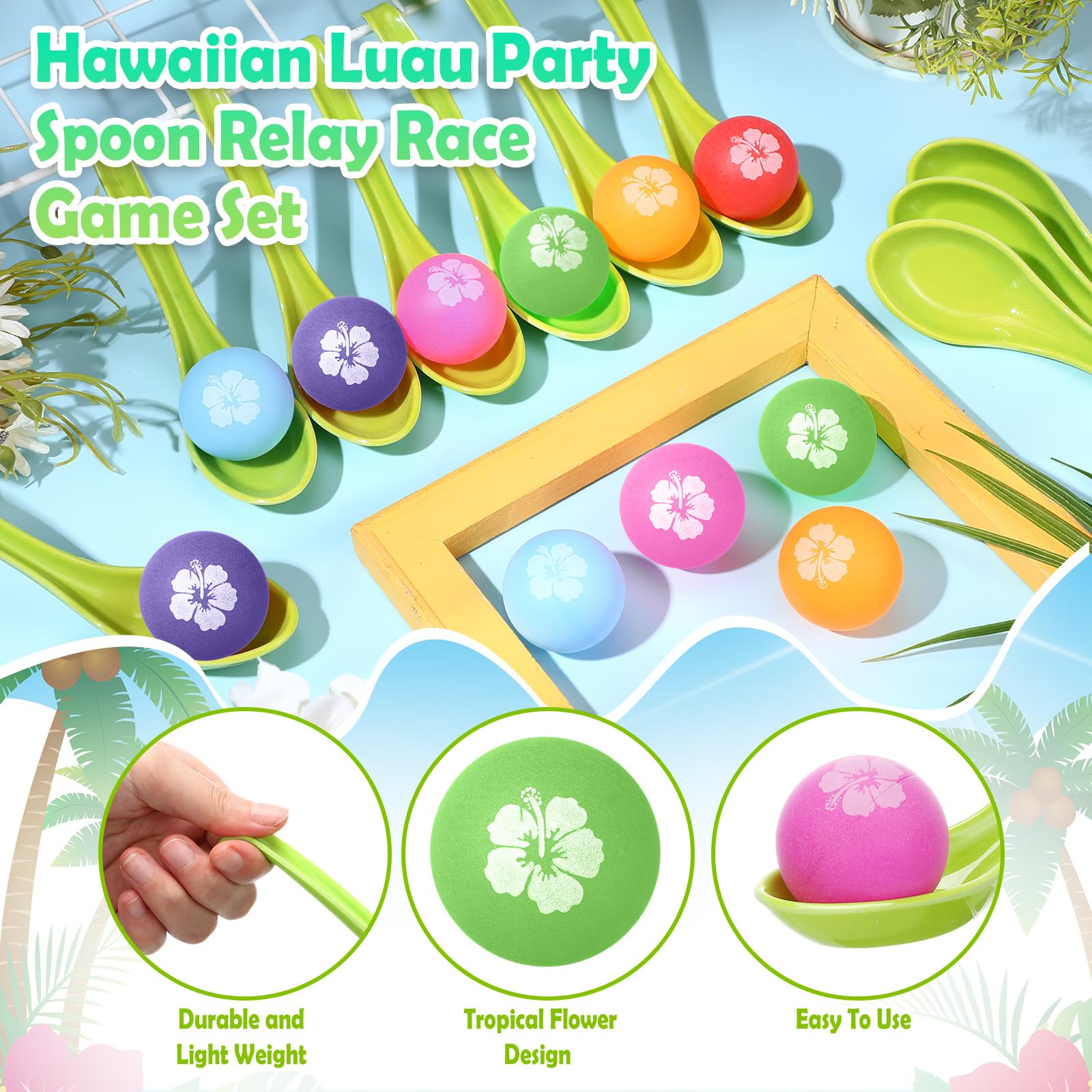 Features: This Hawaiian ball and spoon race game set is suitable for summer beach birthday parties, tropical theme parties, tropical baby showers, Aloha birthday parties, Aloha baby showers, Hawaiian theme birthday parties, Hawaiian baby showers, summer pool parties or any garden parties, its versatility ensures endless fun and enjoyment. Keeping in tune with the Hawaiian Luau party theme, the balls included in this set feature aesthetically pleasing leaf prints. These unique decorative elements promise to add a tropical touch to your party and engage little ones love for colorful, eye catching objects. Specifications: Material: plastic Color: as shown Size: Spoon: 6.3 x 1.69 x 0.59 inches/ 16 x 4.3 x 1.5 cm Balls: 1.6 inch Package includes: 12 x Spoon 12 x Balls Notes: Manual measurement, please allow slight errors on size. The color may exist a slight difference due to different screen displays. Little ones should use our product under the supervision of adults. Please keep it away from people under 6 years old.