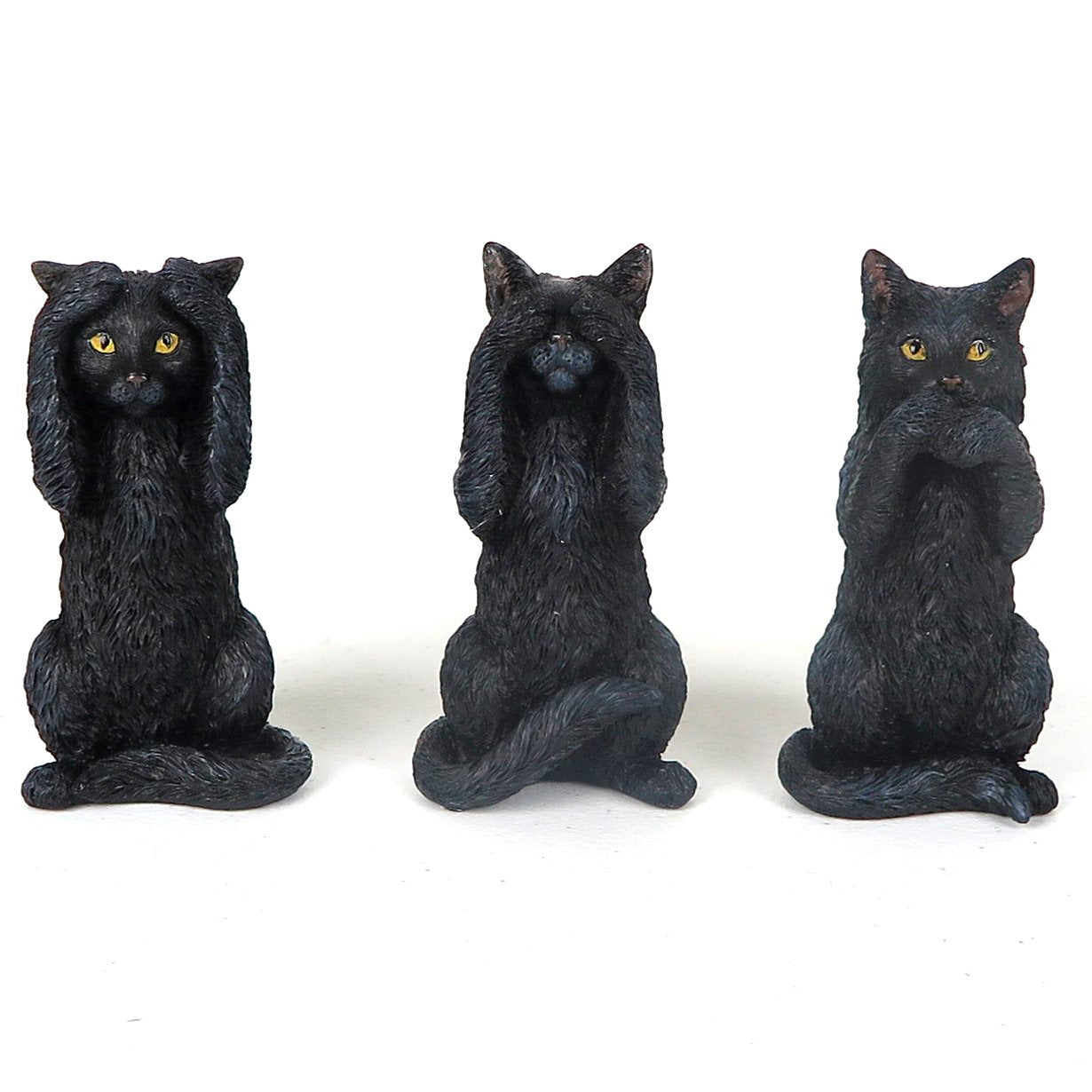 • Q: What makes this Black Kittens figurine unique? A: This figurine is uniquely designed to depict the 'Hear No Evil, Speak No Evil, See No Evil' concept, featuring extreme detail and realistic expressions that make it a standout collectible.