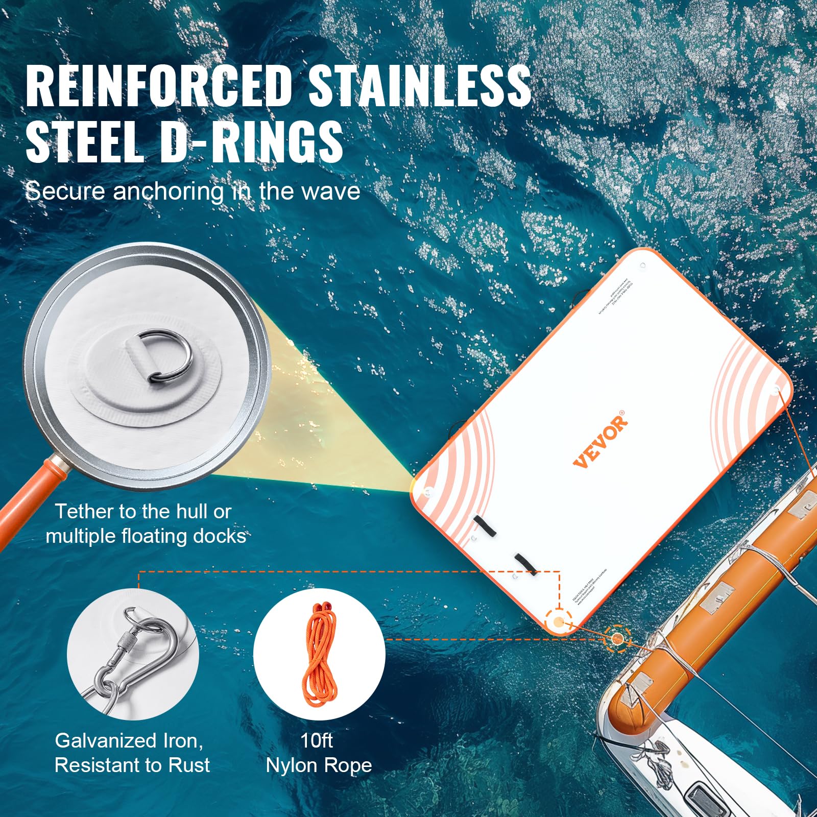 SpecificationsItem Model Number: RD244-152Item Color: White + OrangeProduct Dimensions: 8 x 5 ft / 2.43 x 1.52 mItem Height: 6 in / 152 mmFloating Dock Material: PVC Brushed Non-slip FabricD-Ring Material: Stainless SteelProduct Weight: 32.63 lbs / 14.8 kgPackage Content1 x Nylon Rope4 x Hook Anchors1 x Dual-Action Hand Pump with Pressure Gauge1 x Carry Bag1 x Soft Ladder1 x Woven Cable Tie