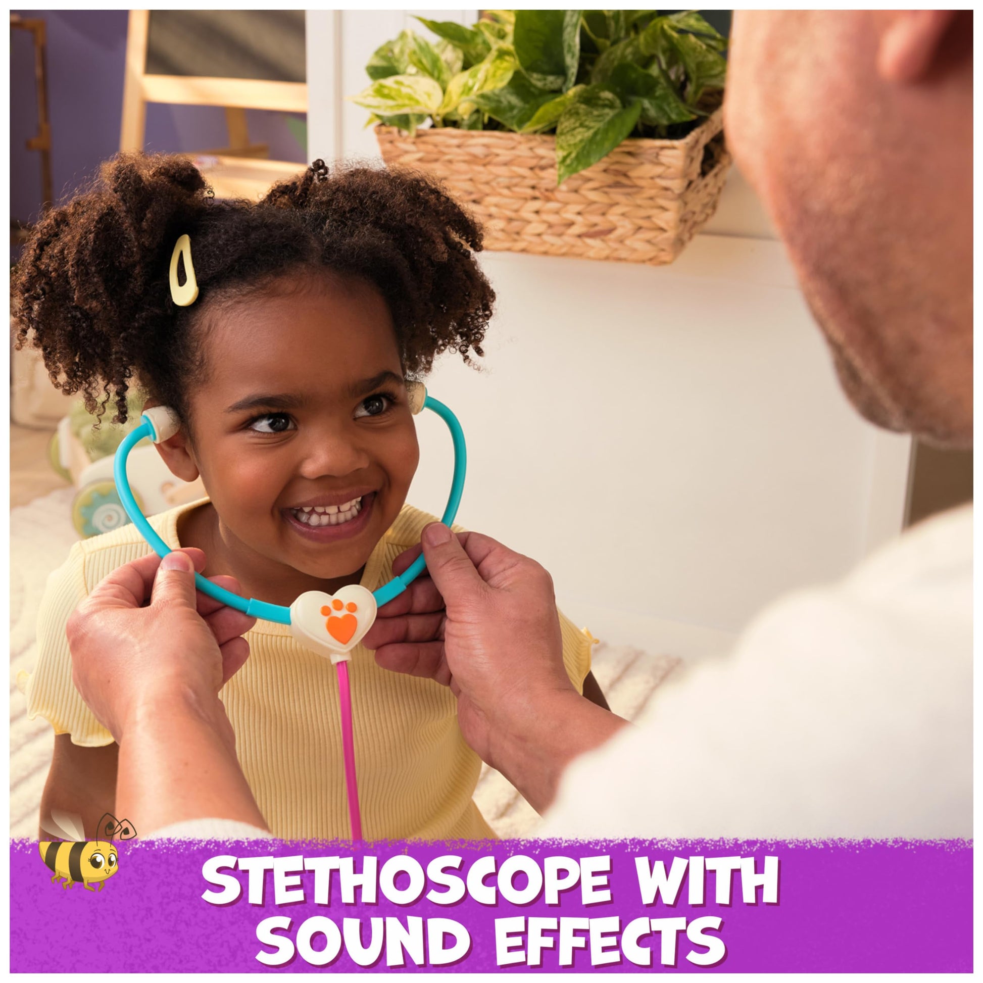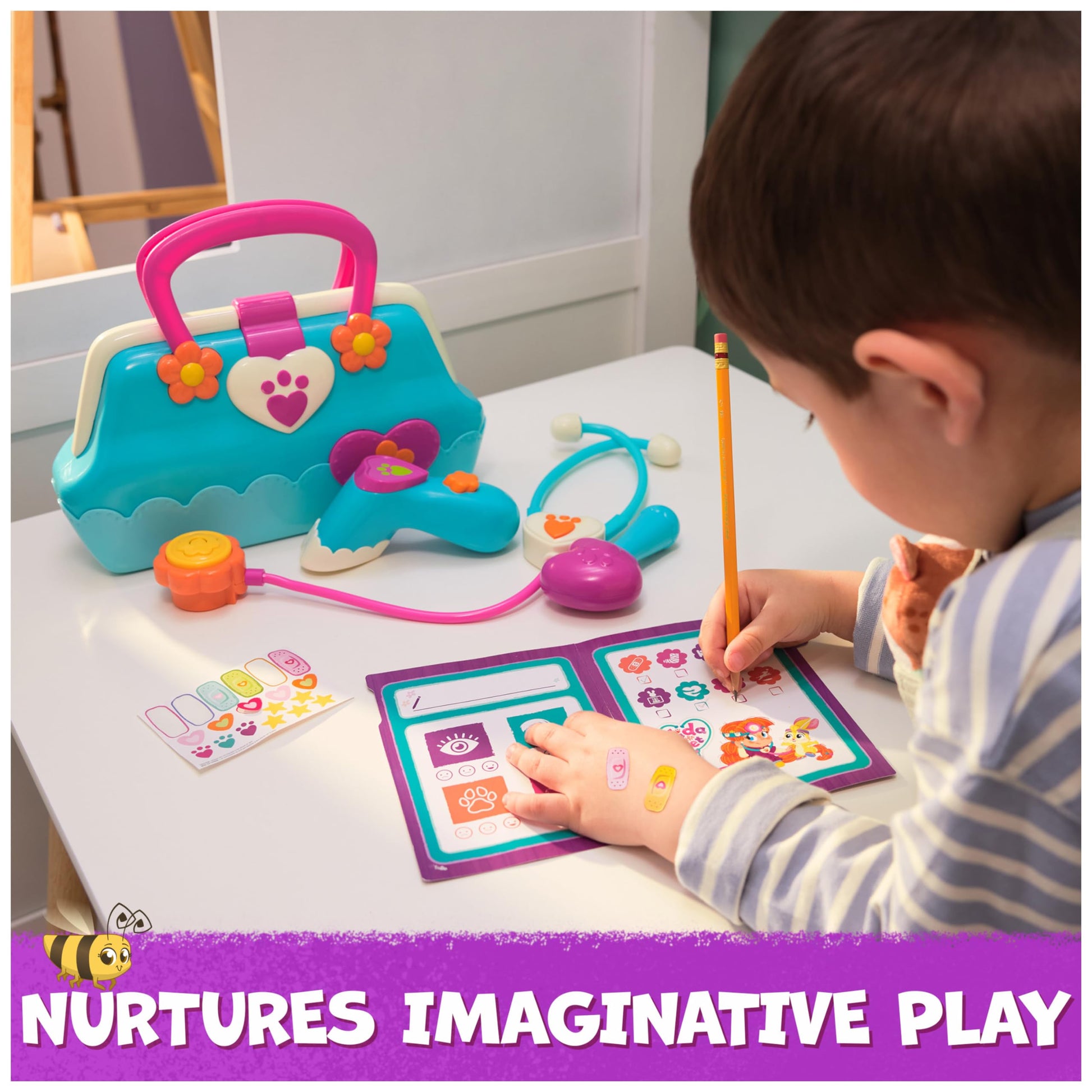 Create thrilling vet-play adventures in Sweetwood, full of caring and healing, with Vidas Vet Bag! This exciting kids doctors play set looks just like it does in the show and features 5 exciting sensory toys, like an electronic stethoscope, a thermometer, and a reflex hammer. It also includes a Popcorn plush toy, a patient chart & a sticker sheet, allowing you to care for your friends & animals, just like Vida! The Vet Bag also works as a toy storage container, so you carry it anywhere, then store all your learning toys after an exciting day of dress up & pretend play. If youre searching for toys for ages 2-4, Vida the Vet toddler toys for kids ages 3 and up are excellent gifts for kids, offering learning toys for girls and boys that love animals & being a pretend play doctor with all their dolls and stuffed animals for girls. Featuring delightful small toys & sensory toys like a stethoscope, in a kids doctor playset, cute stuff like toy figures & playsets, a whimsical tree house vet clinic, & lovable preschool toys like the colorful & vibrant plush toys for girls to pretend to be Vida!