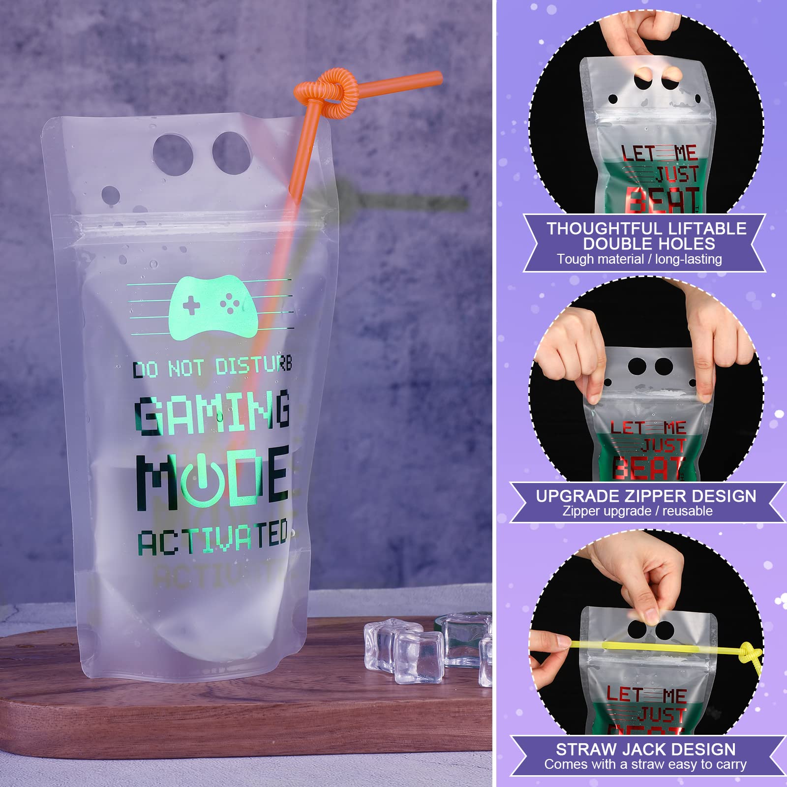 Video Game Party Favors Drink Pouch Cups With Straws Plastic Drink Pouches Clear Zipper Bags Reusable Drink Pouches For Birthday