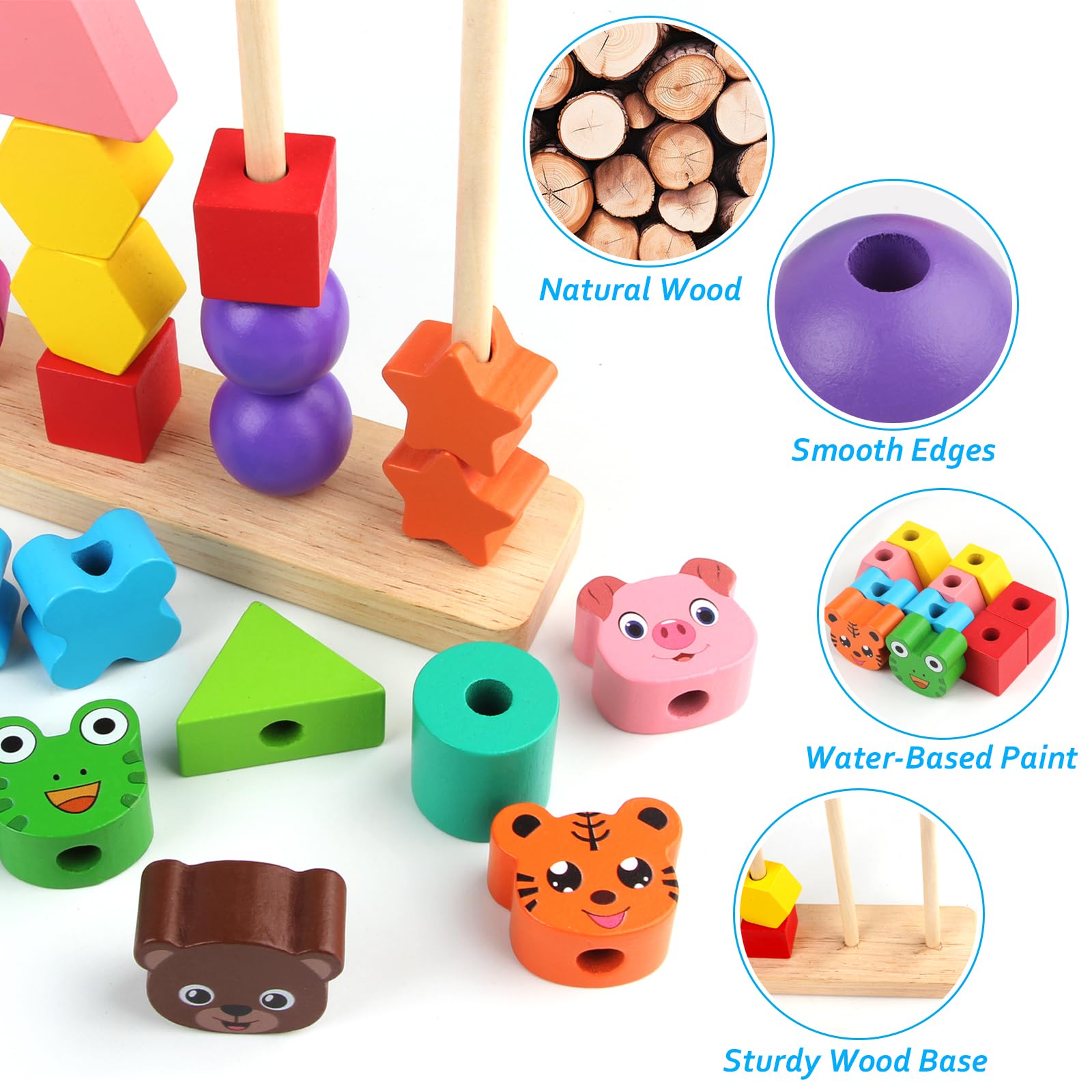 Vinlon Animal Baby Toys For Boys Girls 2 3 4 Years Old - Cute Rabbit Bear Tiger Pig Frog- Wooden Bead Sequencing Set-Stacking Sh