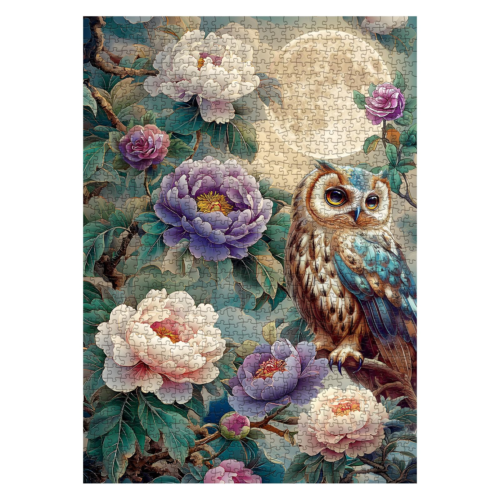 Vintage Owl Puzzles For Adults 1000 Pieces, Pretty Flower Nature Plant Peony Jigsaw Puzzles, Art Beautiful Bird Moon Floral Puzzle