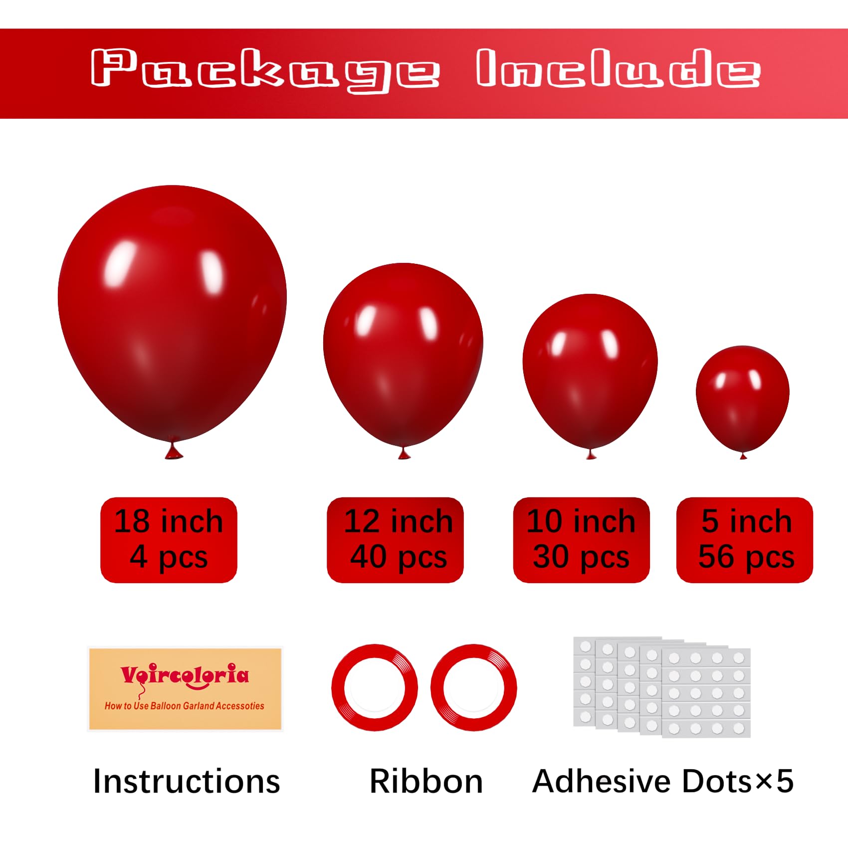 Voircoloria 130Pcs Ruby Red Balloons Different Sizes 18'' 12'' 10'' 5'' Dark Red Latex Balloon Garland Arch Kit For Birthday Baby Shower Graduation Wedding Gender Reveal Valentine'S Day Christmas Party Decorations Total 130Pcs Ruby Red Balloons Package Includes: 56Pcs 5Inch Ruby Red Balloons 30Pcs 10Inch Ruby Red Balloons 40Pcs 12Inch Ruby Red Balloons 4Pcs 18Inch Ruby Red Balloons 2Pcs Roll Of Ribbons 100Pcs Adhesive Dots 1 Book Instruction Manual Of Balloon Accessories Warm And Sweet Reminders: 1.Please Do Not Inflate Deep Red Balloons More Than 90%, Or Rub Against Overheated And Sharp Objects To Avoid Sudden Popping. 2.Get Crimson Red Latex Balloons And Can Open It If You Have Any Questions About Balloons, You Can Contact Us In Advance Before The Party Starts. 3.All Usage Of Balloon Accessories Are In The Manual, But The Balloon Kit You Buy May Not Include All Balloon Accessories. Please Rest Assured That&Nbsp; The Voircoloria Balloon Kit Will Provide You With All The Necessary Balloon Accessories. 4.Strong Winds Or Excessive Clapping May Cause Them To Burst