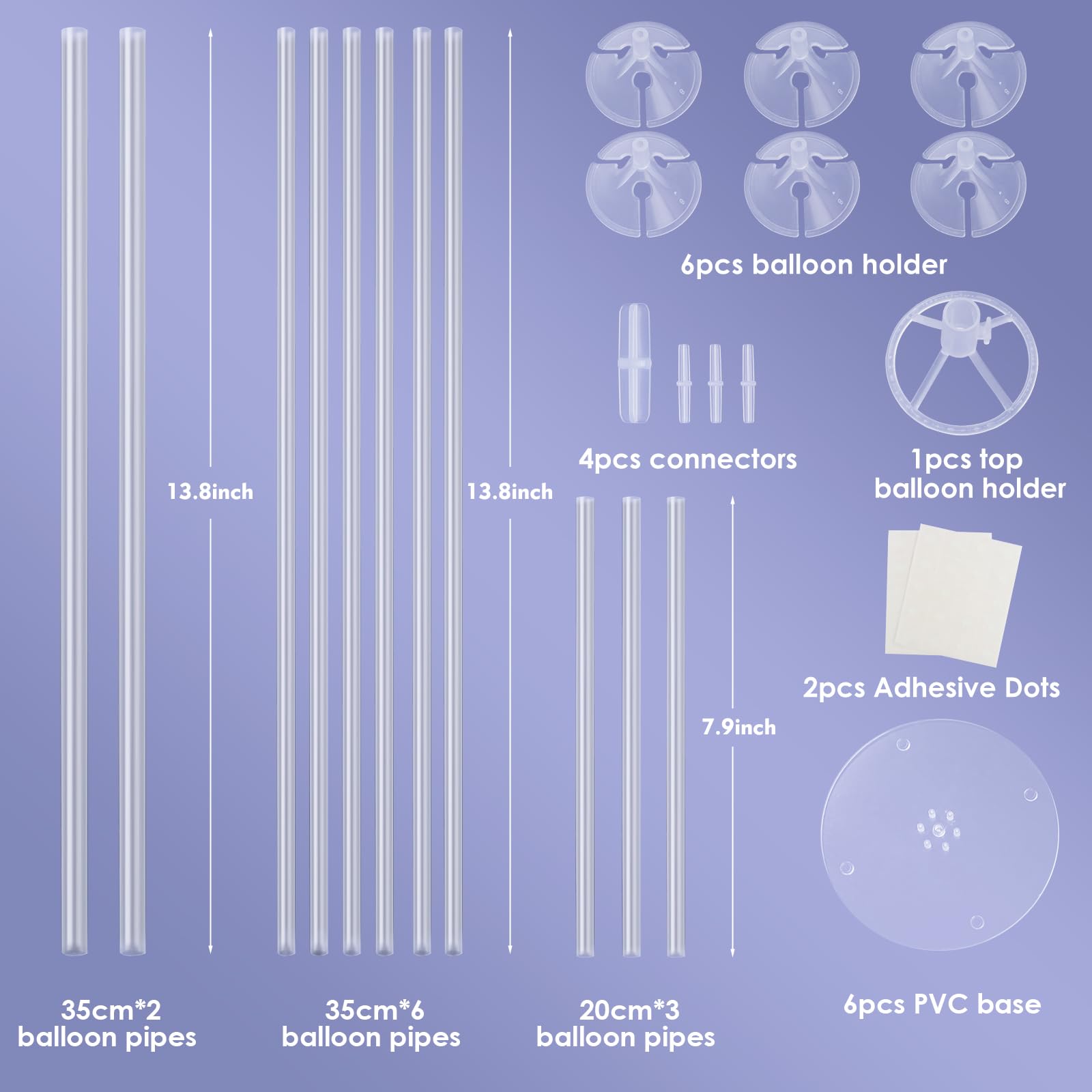 - Q: What is included in the Voircoloria Balloon Stand Kit? A: The Voircoloria Balloon Stand Kit includes 6 sets of table balloon stands, 2 adhesive dots, 7 cups, 1 base, 4 connection joints, 3 poles measuring 7.9 inches, and 8 poles measuring 13.8 inches. Please note that balloons are not included.