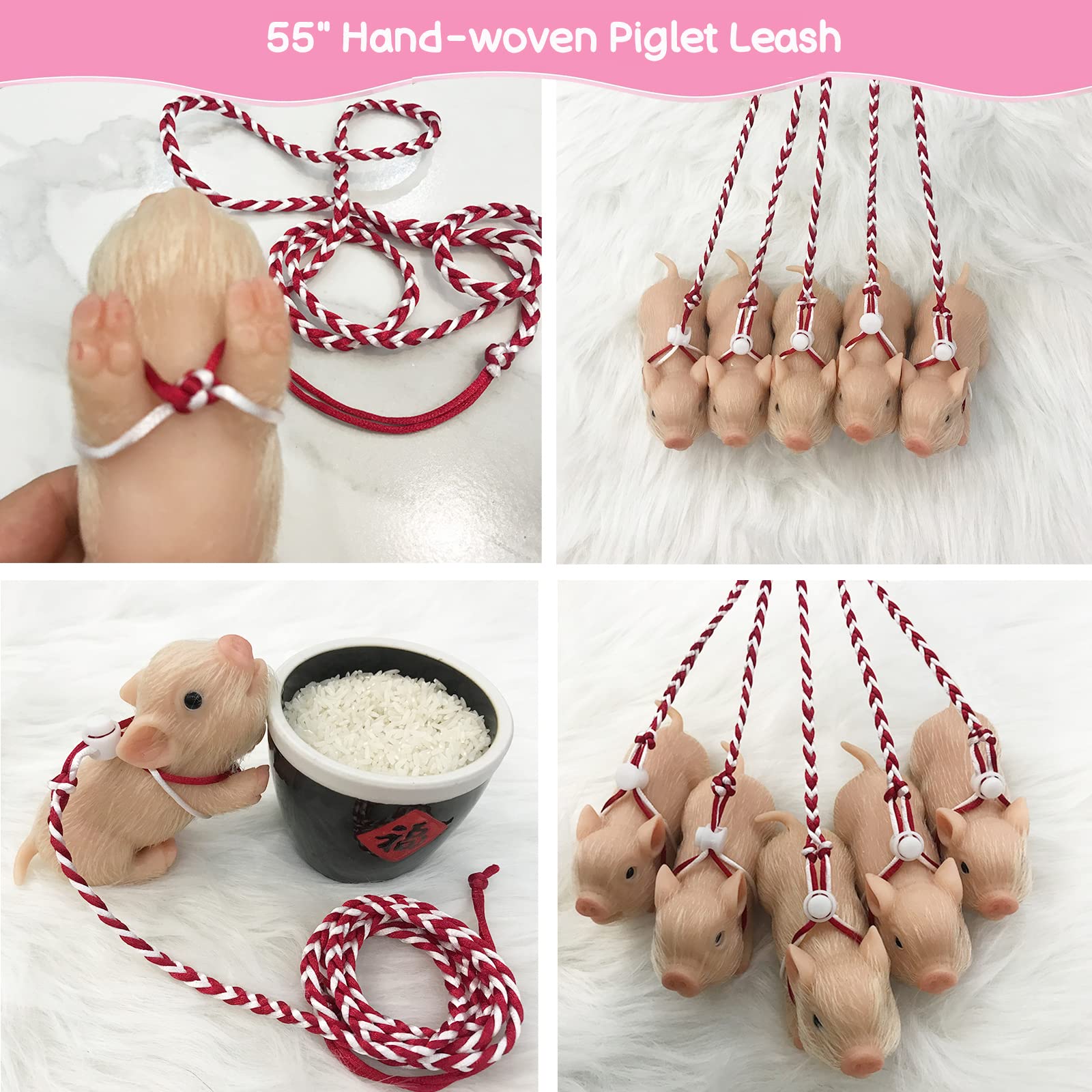 • Q: What accessories are included with the silicone piglet? A: The package includes one silicone piglet, a stylish scarf, a pig's bed, a nursing bottle, a rainbow bridge, a piglet leash, and a bow tiara, providing everything needed for role play and care games.