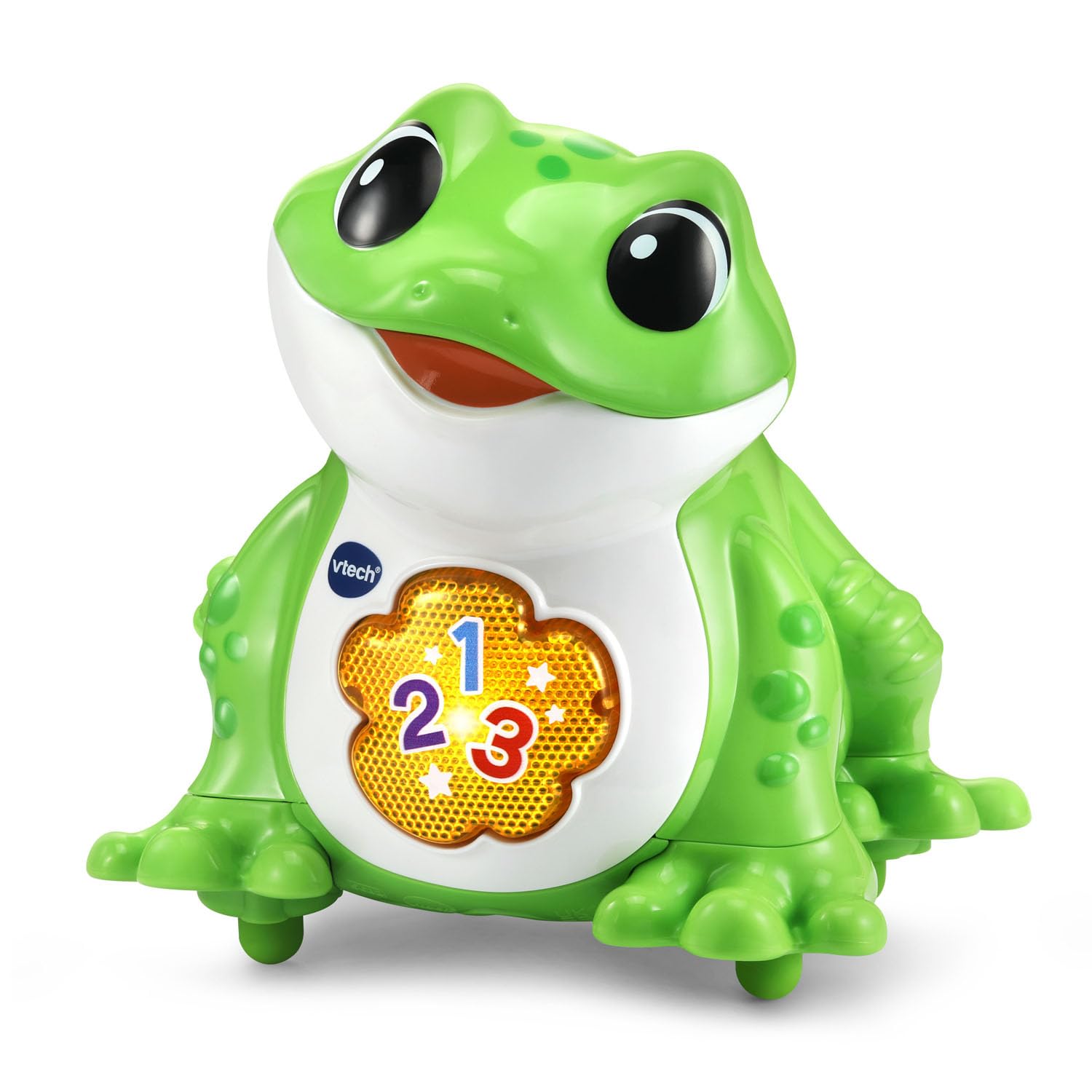 Bounce and hop around with this energetic frog who gets toddlin tadpoles up and moving! Place the frog on the floor and watch as they try to copy the movements. Play the hop and stop game: bounce and follow along as the frog hops around, then freeze when it stops. When its time to take a break, little ones can work on their button-pushing skills by pressing the big button on the frogs chest. Theyll giggle with delight as their new froggy friend introduces numbers, sings cheery songs and talks about what frogs enjoy...like hopping on lilly pads! After theyre rested, its time to bounce right back into playtime. Hop, hop, hooray! Intended for ages 12-36 months. Requires 4 AA batteries. Batteries included for demo purposes only. New batteries recommended for regular use.
