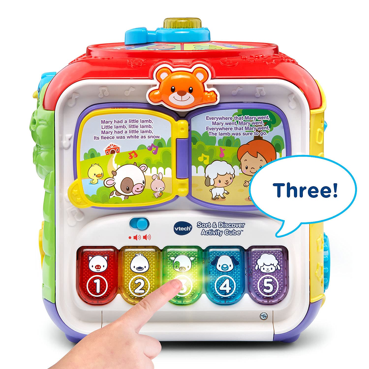 - Q: What types of activities does the activity cube offer? A: The activity cube features five sides of fun with seven entertaining activities, including a shape sorter, spinner, book page with nursery rhymes, and electronic panels that introduce colors, numbers, and animals.