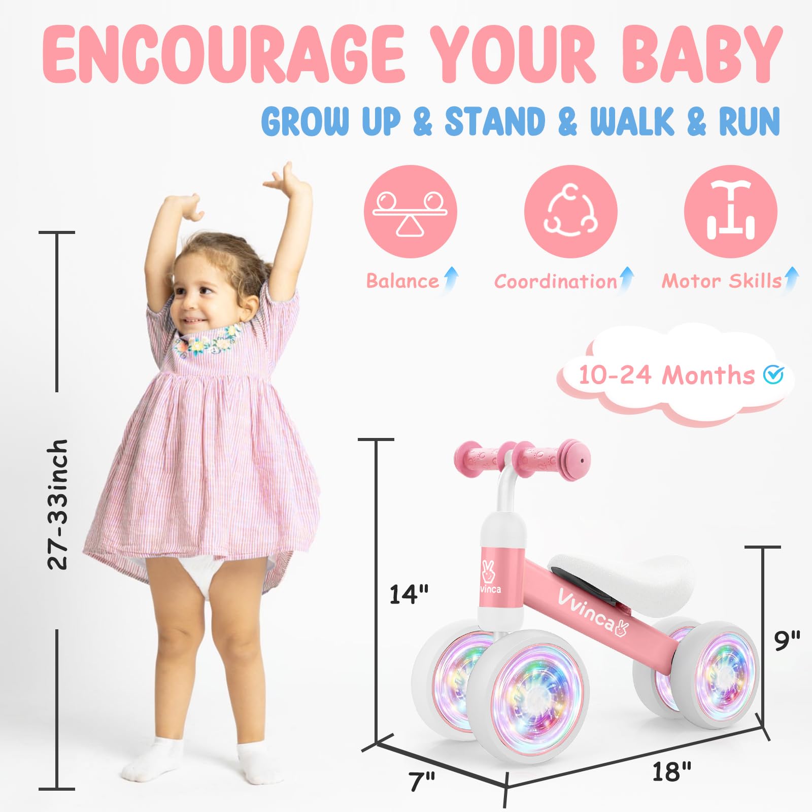 Vvinca Baby Balance Bike For 1 Year Old Girl Gifts, 4 Colorful Lighting Silent Wheels, 10-24 Month Toddler Soft Seat Balance Bik