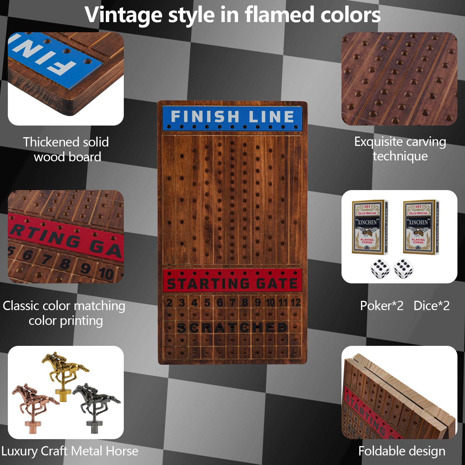 Wahartoly 21 In Large Luxury Thickened Wood Foldable Horse Race Board Game Finish Line Game With 11 Metal Model Horses 2 Sets Of