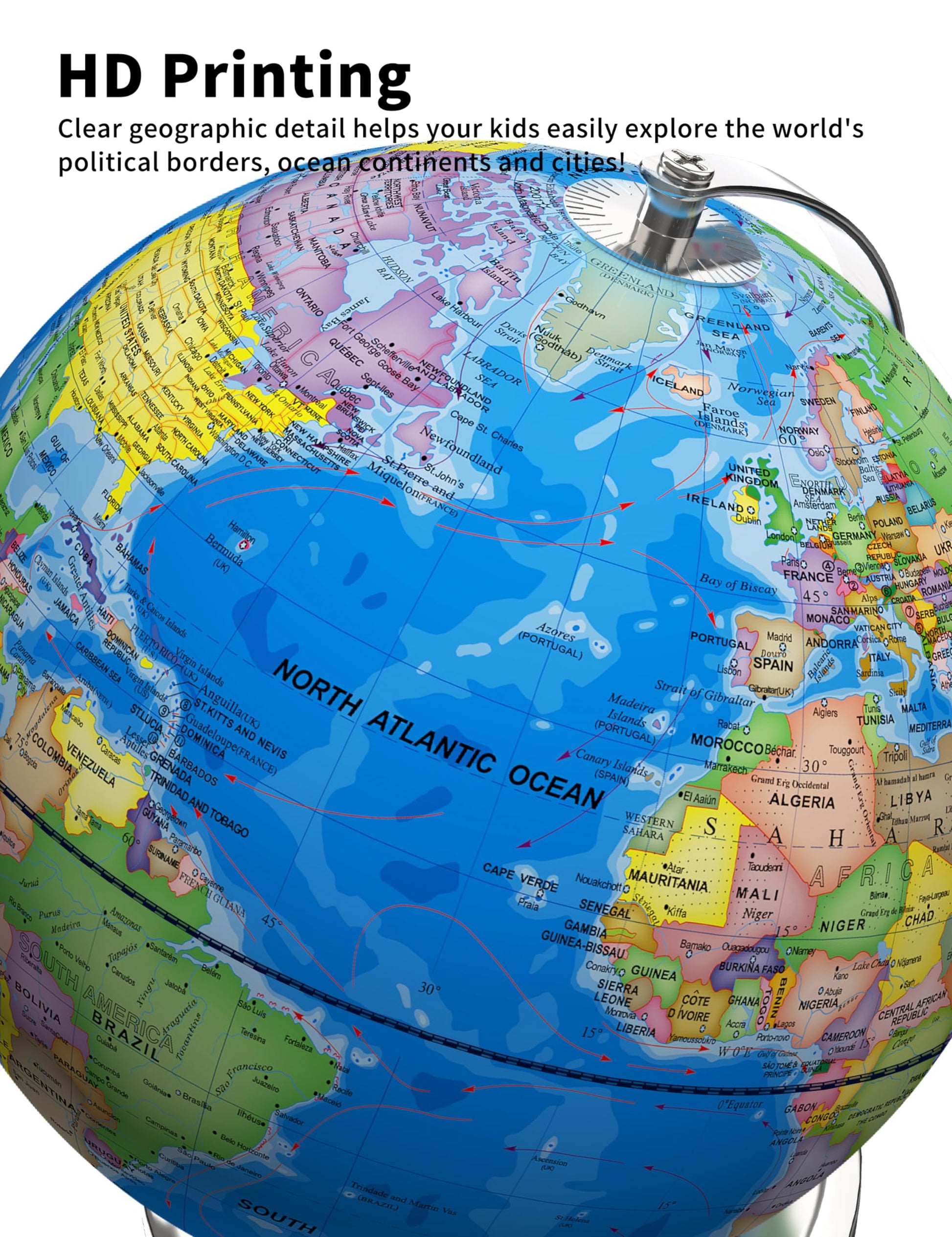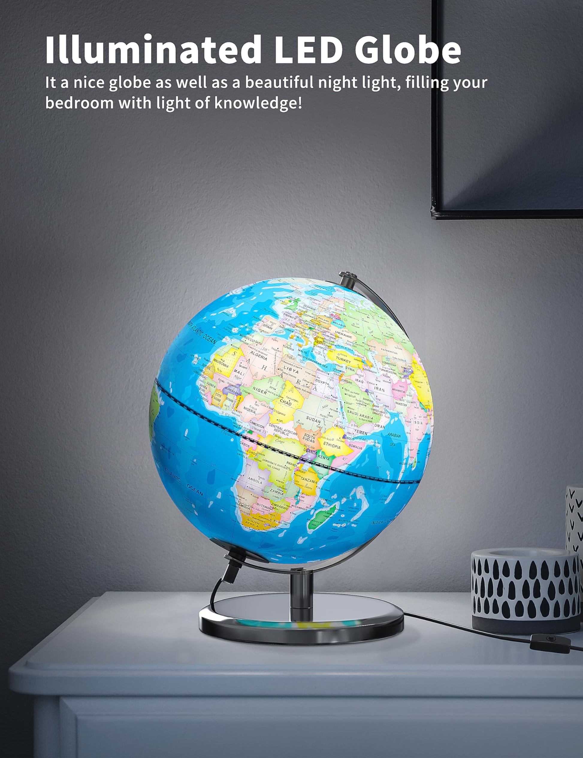 - Q: What makes the Waldauge 9" Illuminated World Globe suitable for kids? A: The Waldauge 9" Illuminated World Globe features a colorful HD printed map that is easy to read, making it perfect for children's learning. Its heavy metal base ensures stability when kids rotate it, promoting an interactive and educational experience.