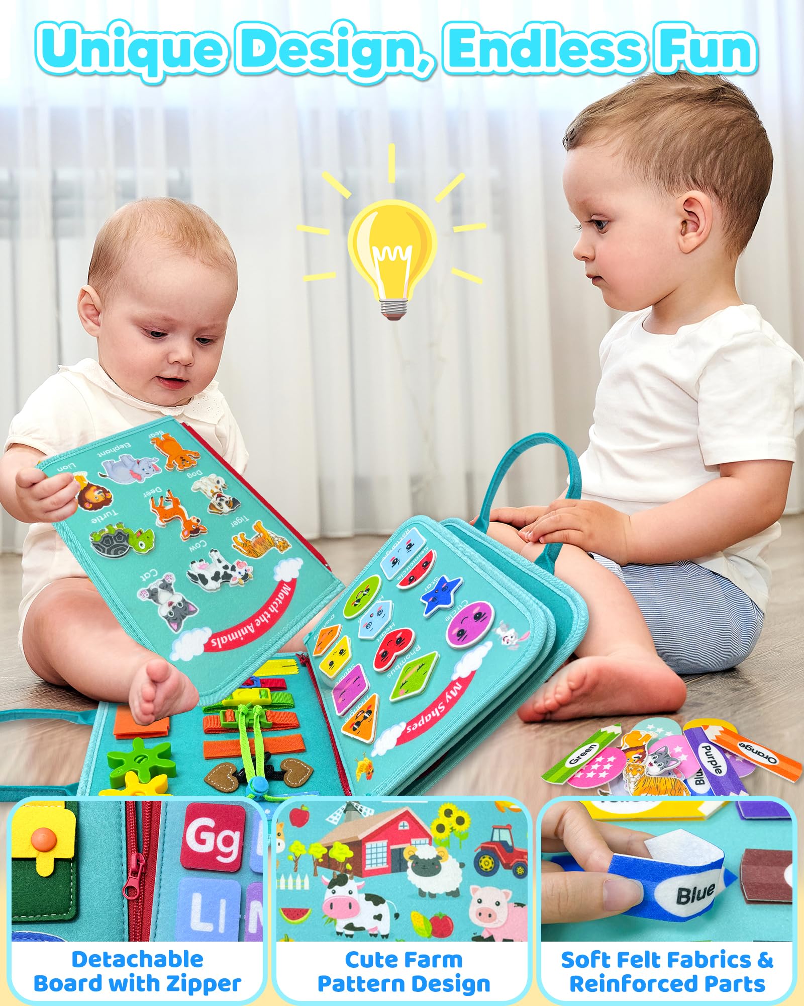 - Q: What activities are included in the Busy Board? A: The Busy Board features 8 pages with 24 interactive learning activities, including basic dress skills, letters, numbers, shapes, colors, matching animals, and a farm-themed puzzle game.