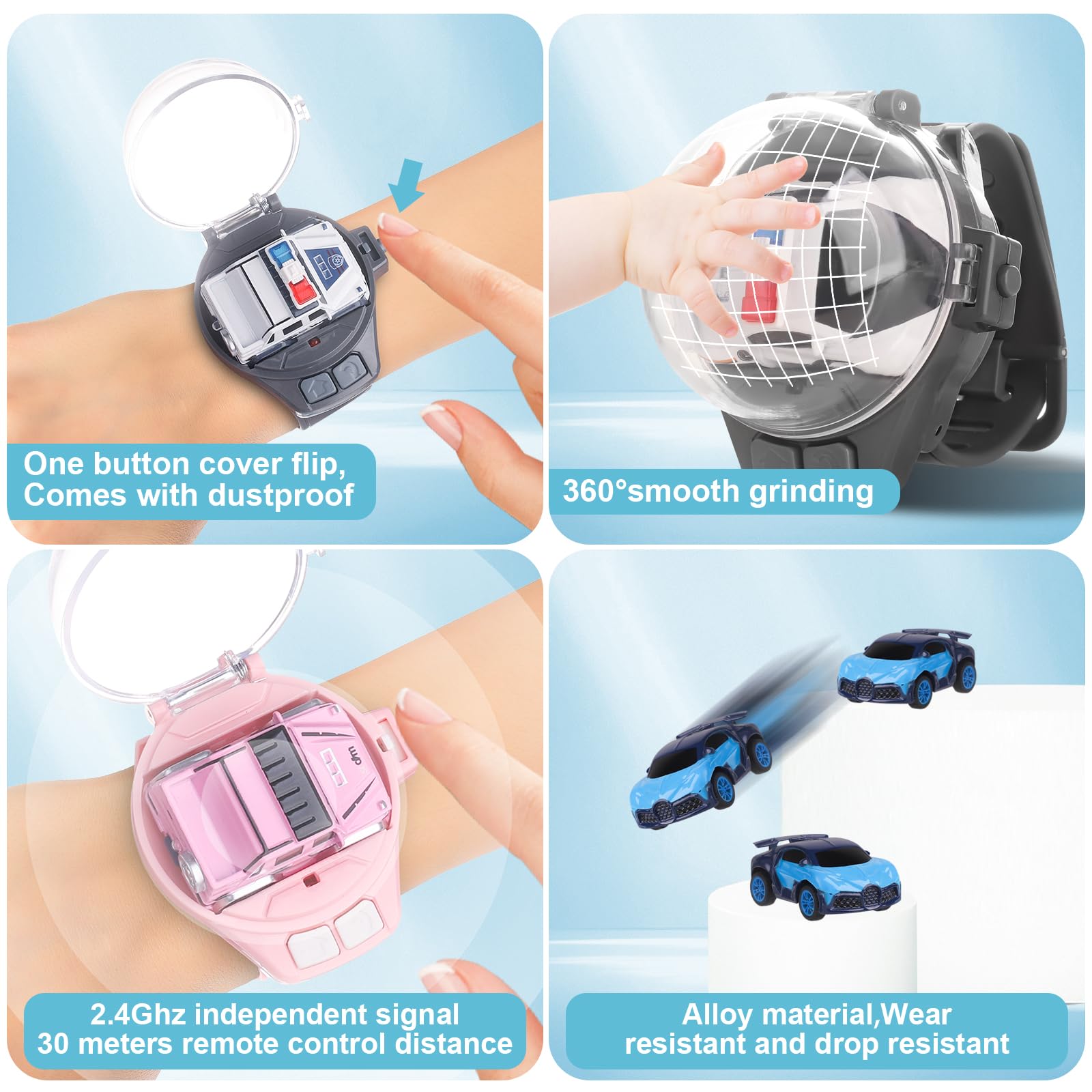 Mini Remote Control Car Watch Toys : Suitable size for easy carrying. Allow children to bring remote-controlled cars anywhere. The buttons are easy to operate and do not require any bulky remote control, as the watch itself is the controller. | 2.4G Infrared Remote Control : The infrared emission in a wide rangeand the signal is independent.It has an anti-jamming function which without remote confusion though two or more vehicle racing togetherWhether outdoors or indoors, children can enjoy competitions with friends. | USB Charging : Supports USB charging, with wires compatible with various power sources. Please turn off the car while charging. The remote control watch only requires a 1.5V AAA battery for power supply. (Including) | Dust-Proof Cover : The watch is equipped with a dust-resistant cover, easily opened with a single button press, safeguarding the car from potential damage.One-touch button, easily open the fun of children's play. | Perfect Gift Choice :This mini remote-controlled car watch toy is made of sturdy ABS material and emits flashing lights when powered on. It is an ideal choice for children's holiday and birthday gifts.