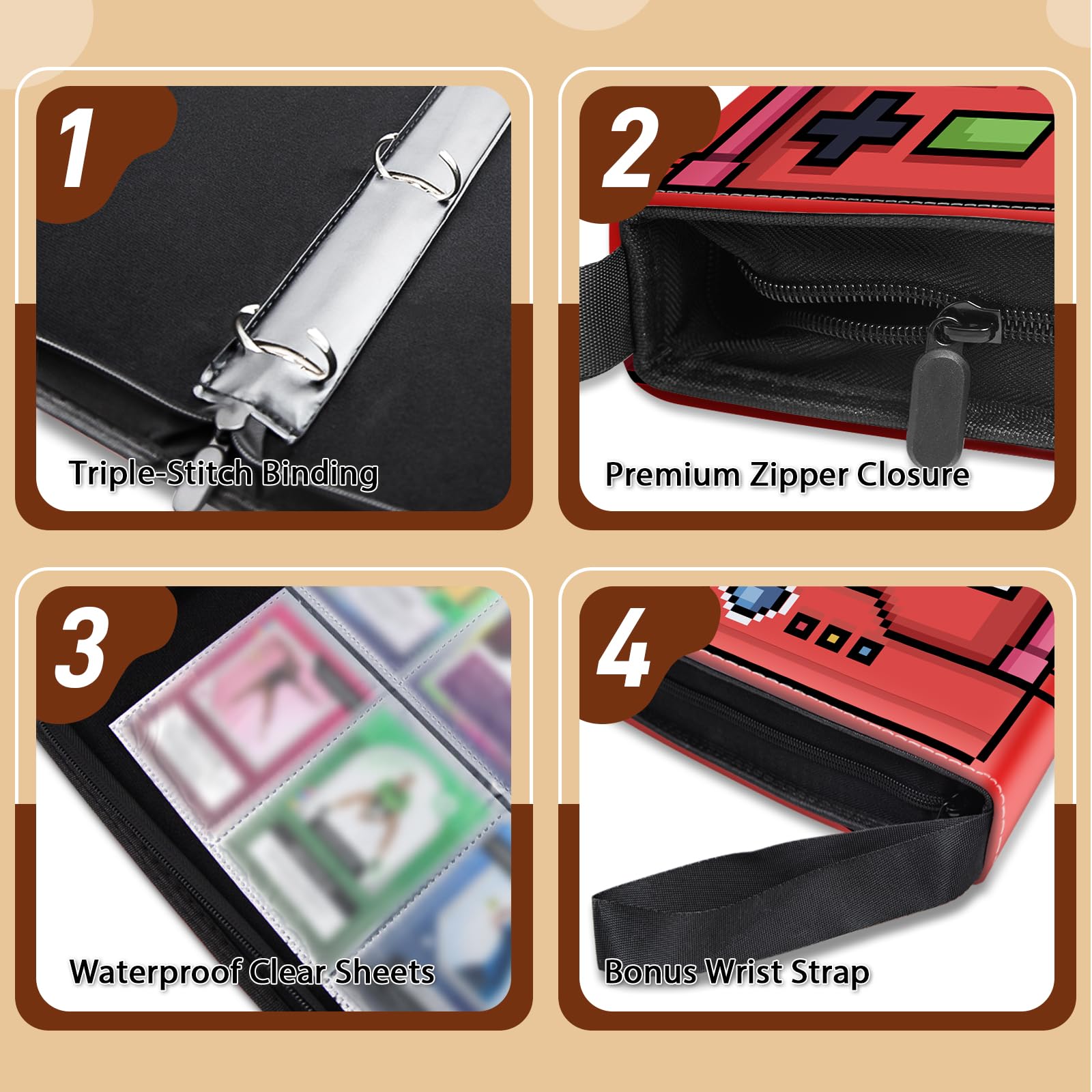 Wazzio 900 Pocket Game Card Binder Trading Card Storage Album with 50 Durable 9-Pocket Pages Game Design on Pocket Card Packs Gifts for Gamer Lover Zipper Closure Collector's Album