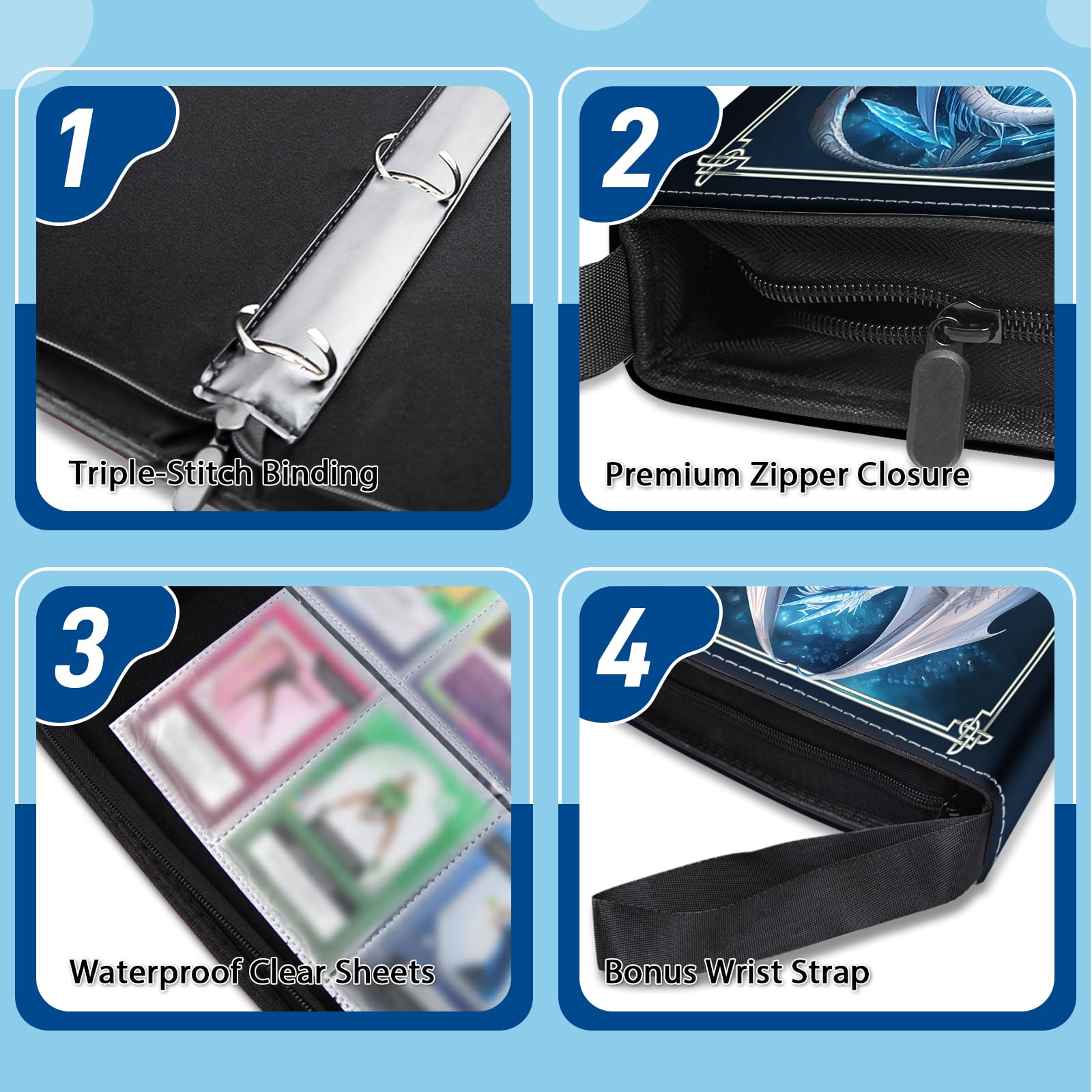 View compareWazzio 900 Pocket Trading Card Storage Album Card Binder with 50 Durable 9-Pocket Pages Birthday Gifts for Fathers Day Blue Dragon Design on Pocket Card Packs Gifts for Zipper Closure Collector